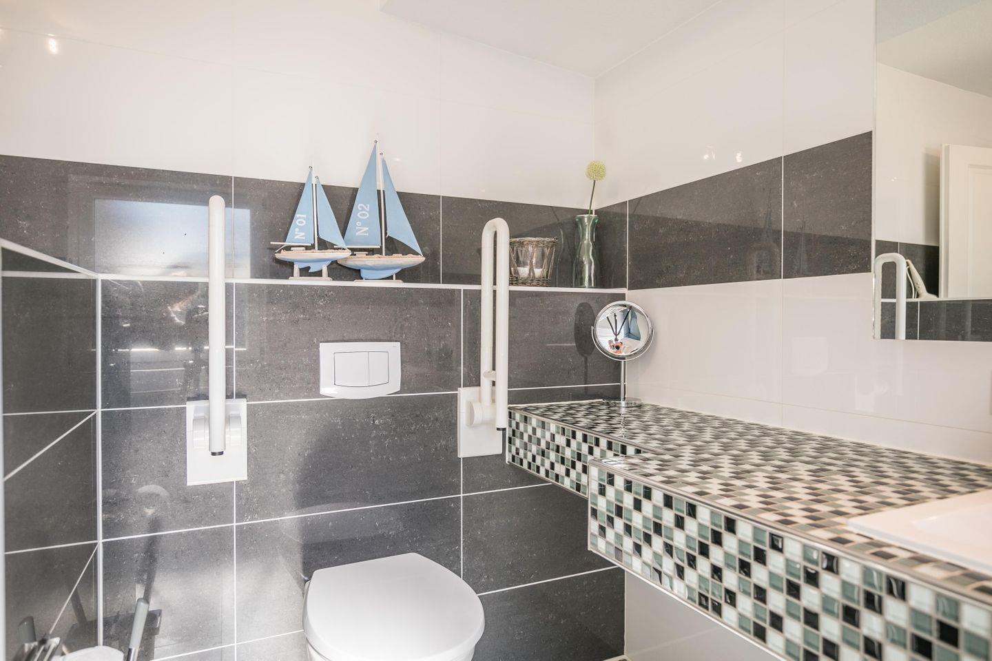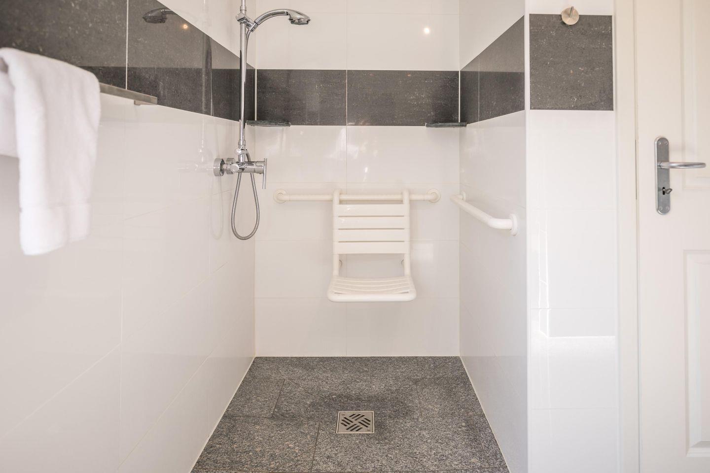 Erdgeschoss, barrierefreie große Dusche mit Bodeneinlauf einhängbare behindertengerechte Sitzmöglichkeit und Haltegriffen, WC mit Haltegriffen, Fenster, Fön, Fußbodenheizung