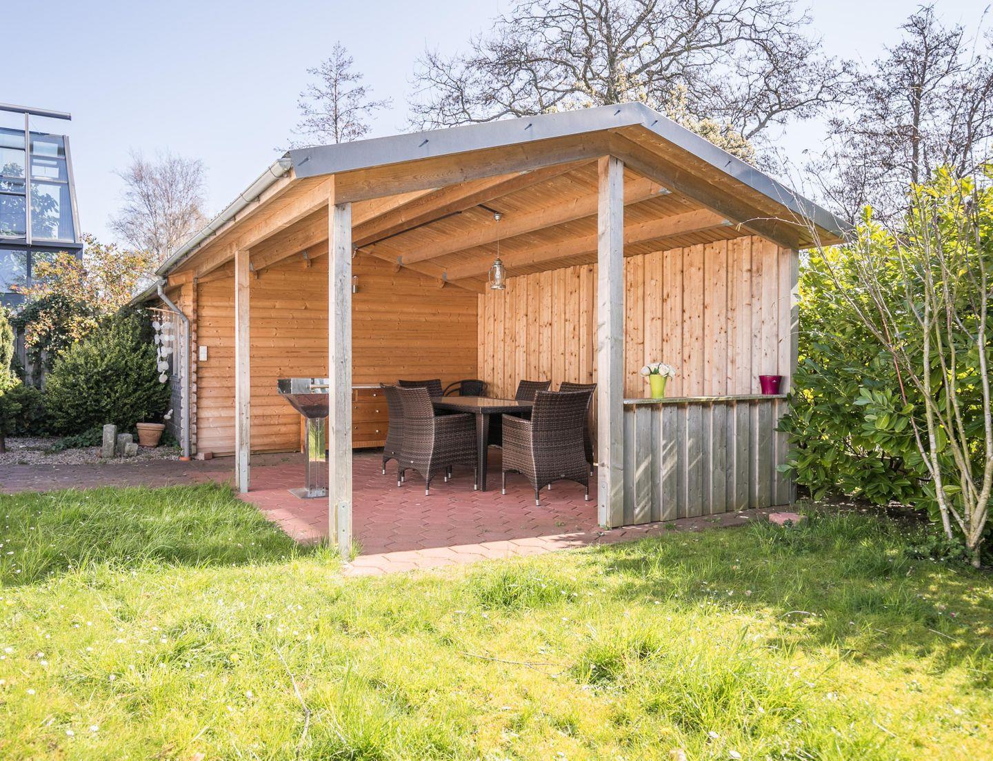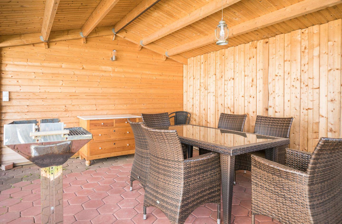überdachte und möblierte Terrasse, eingefriedeter Garten, Gartenmöbel, Auflagen, Sonnenschirm, Holzkohlegrill, Sonnenliege, Rasen