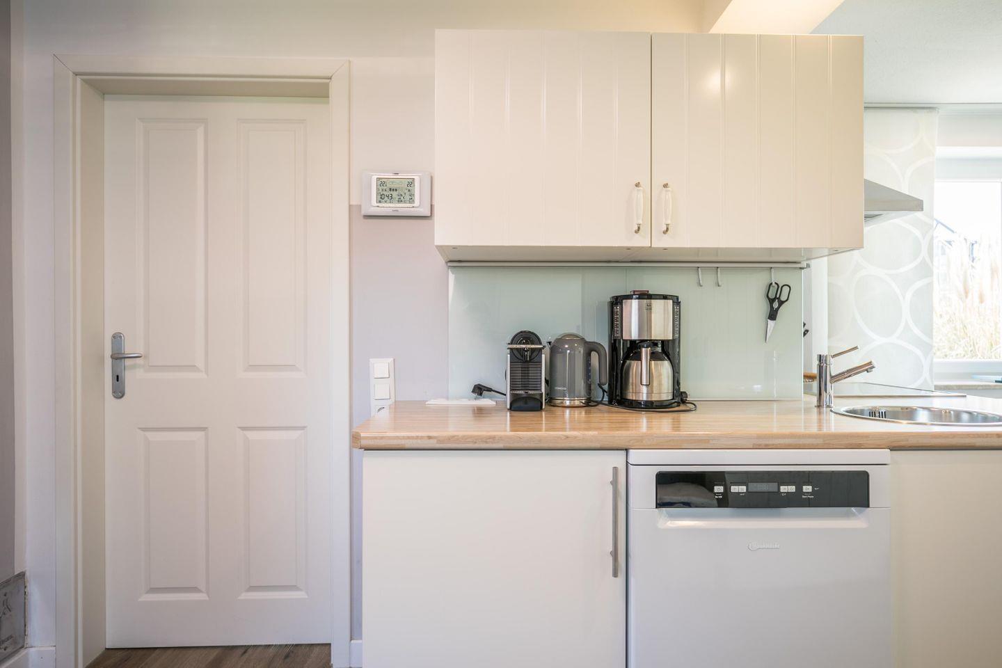Der eingezäunte Garten mit überdachter Terrasse, Gartenmöbeln, Strandkorb und Grill lädt zum Verweilen ein. Für Familien stehen Babyreisebett und Hochstuhl bereit. Drei private Parkplätze, ein Abstellraum für Fahrräder, Waschmaschine, Trockner sowie kostenloses WLAN runden das Angebot ab.