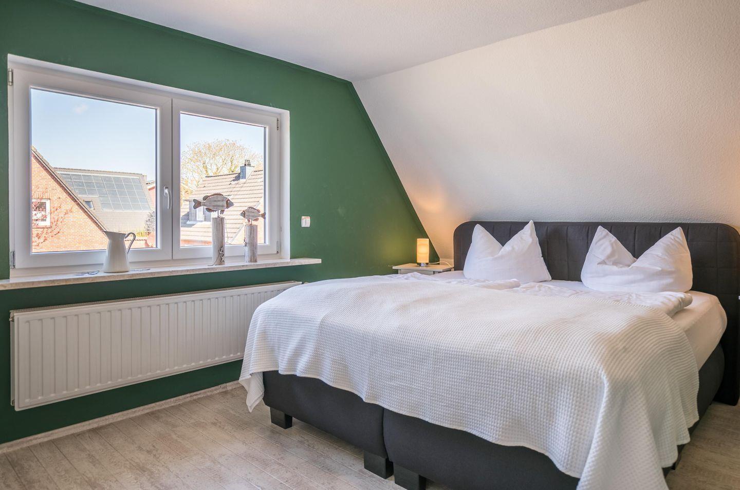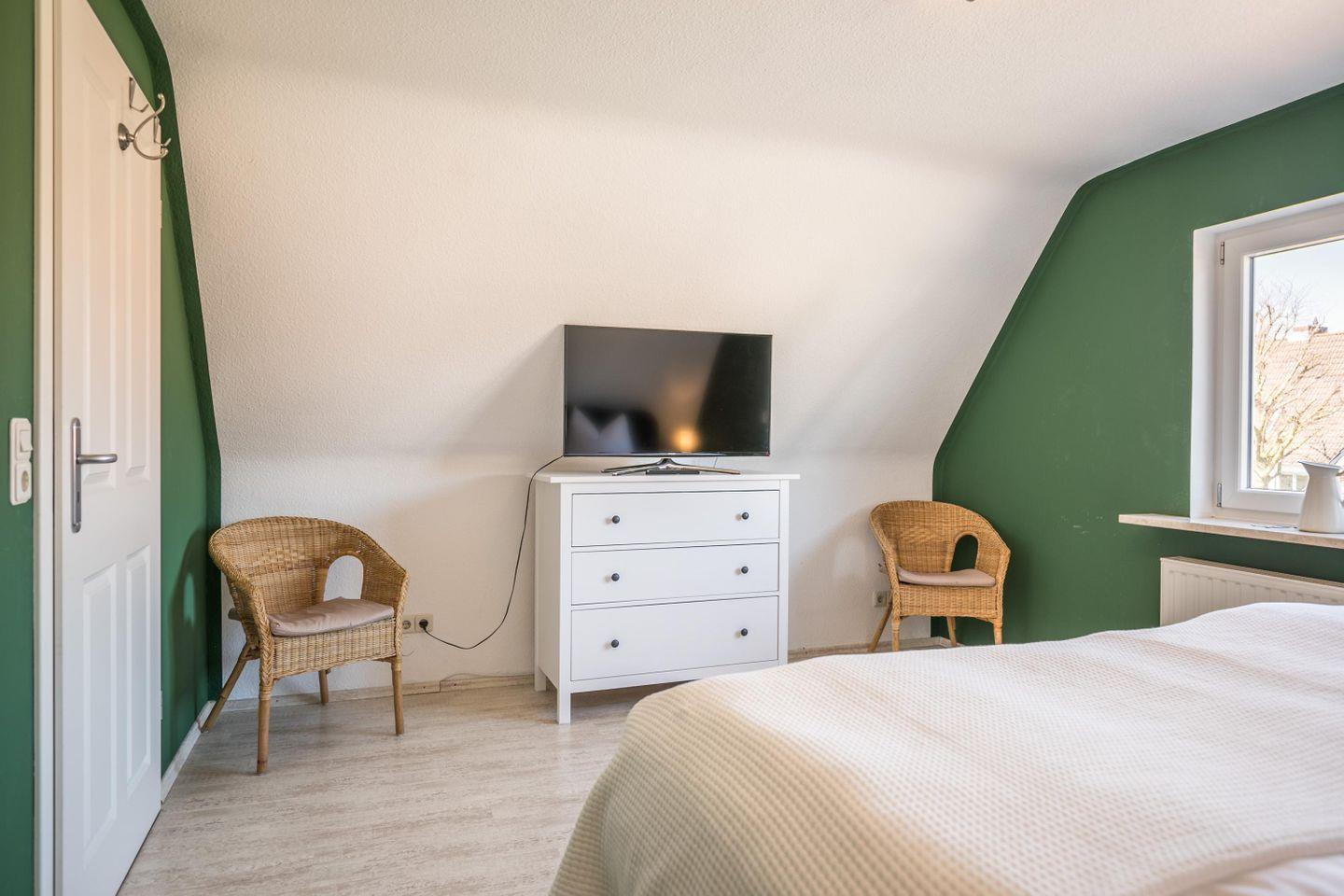 Obergeschoß, Boxspringdoppelbett (1,80x2,00m), Flachbild-TV, 2 Nachtschränke, 2 Korbsessel, Kleiderschrank, elektr. Außenrolläden