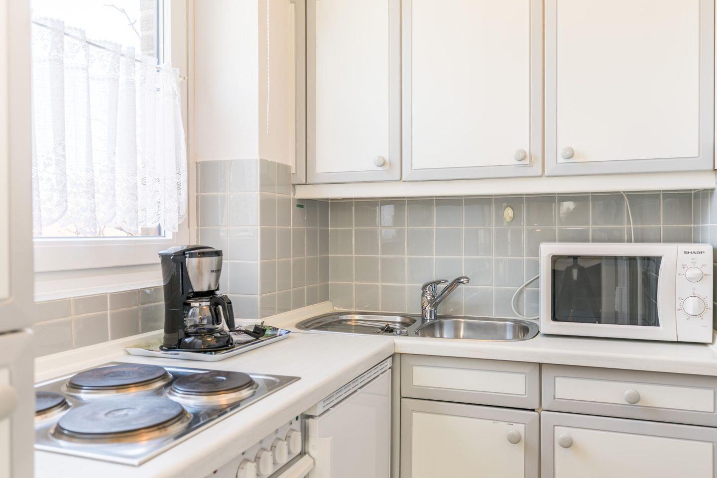Herd mit 4 Kochplatten, Backofen, Mikrowelle, Kaffeemaschine, Toaster, Wasserkocher, Eierkocher, Kühlschrank