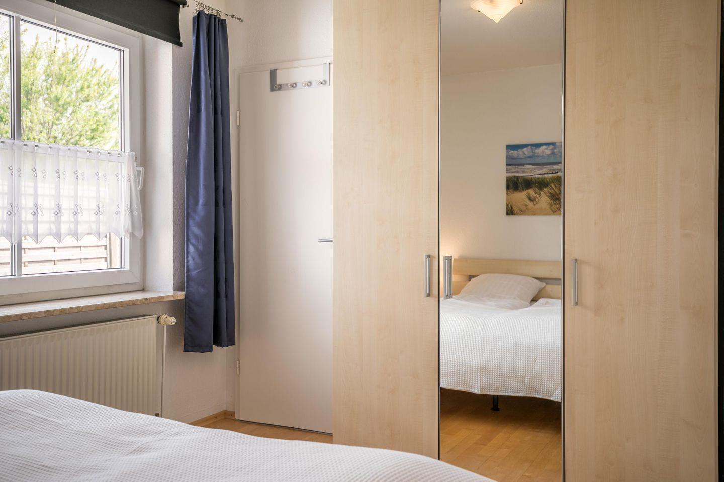 Doppelbett, Kleiderschrank, Spiegel, Kommode, Korbsessel, Stuhl, Parkettboden