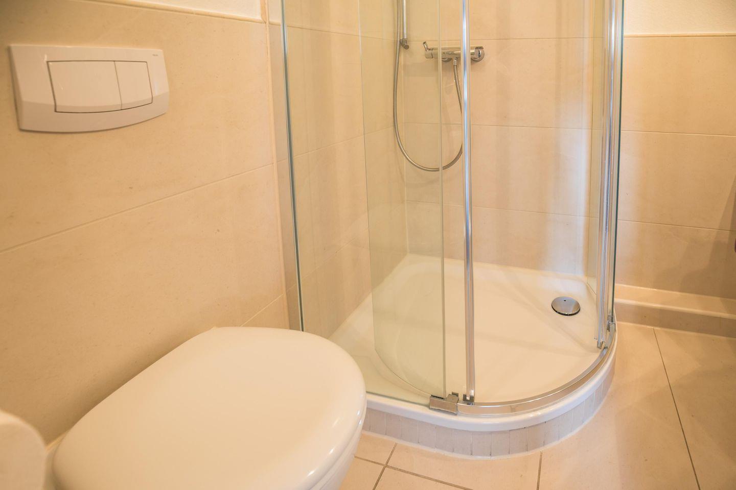 Dusche, WC, Waschbecken, Spiegel, Handtuchtrockner, Föhn, Abluft