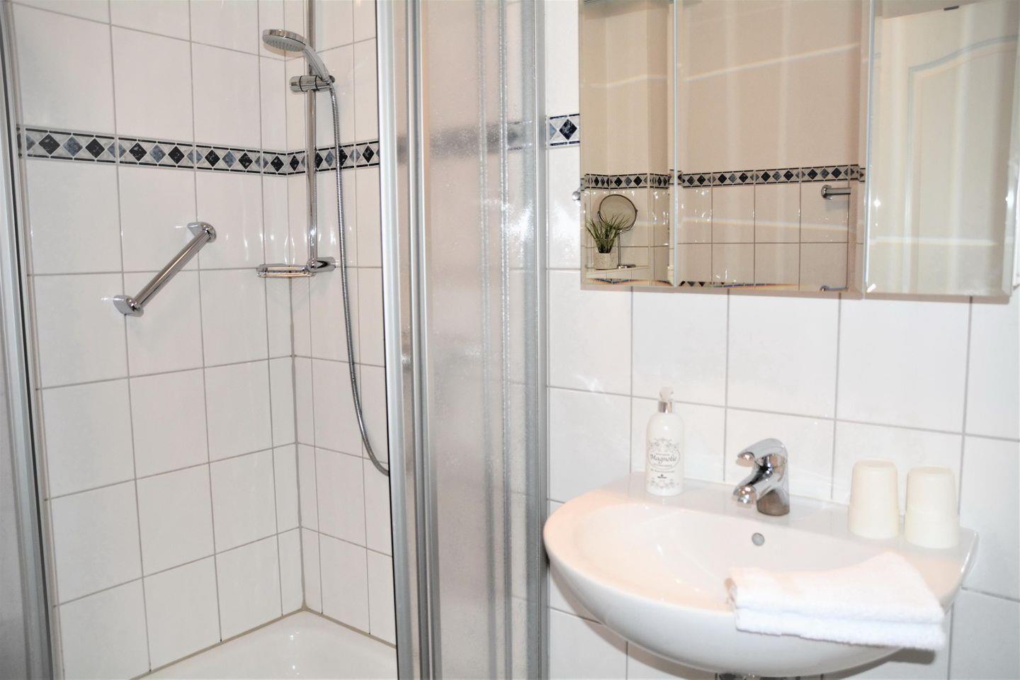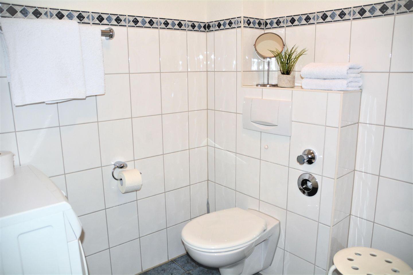 Dusche, WC, Waschtisch, Spiegelschrank, Waschmaschine, Föhn, Hocker, Lüfter