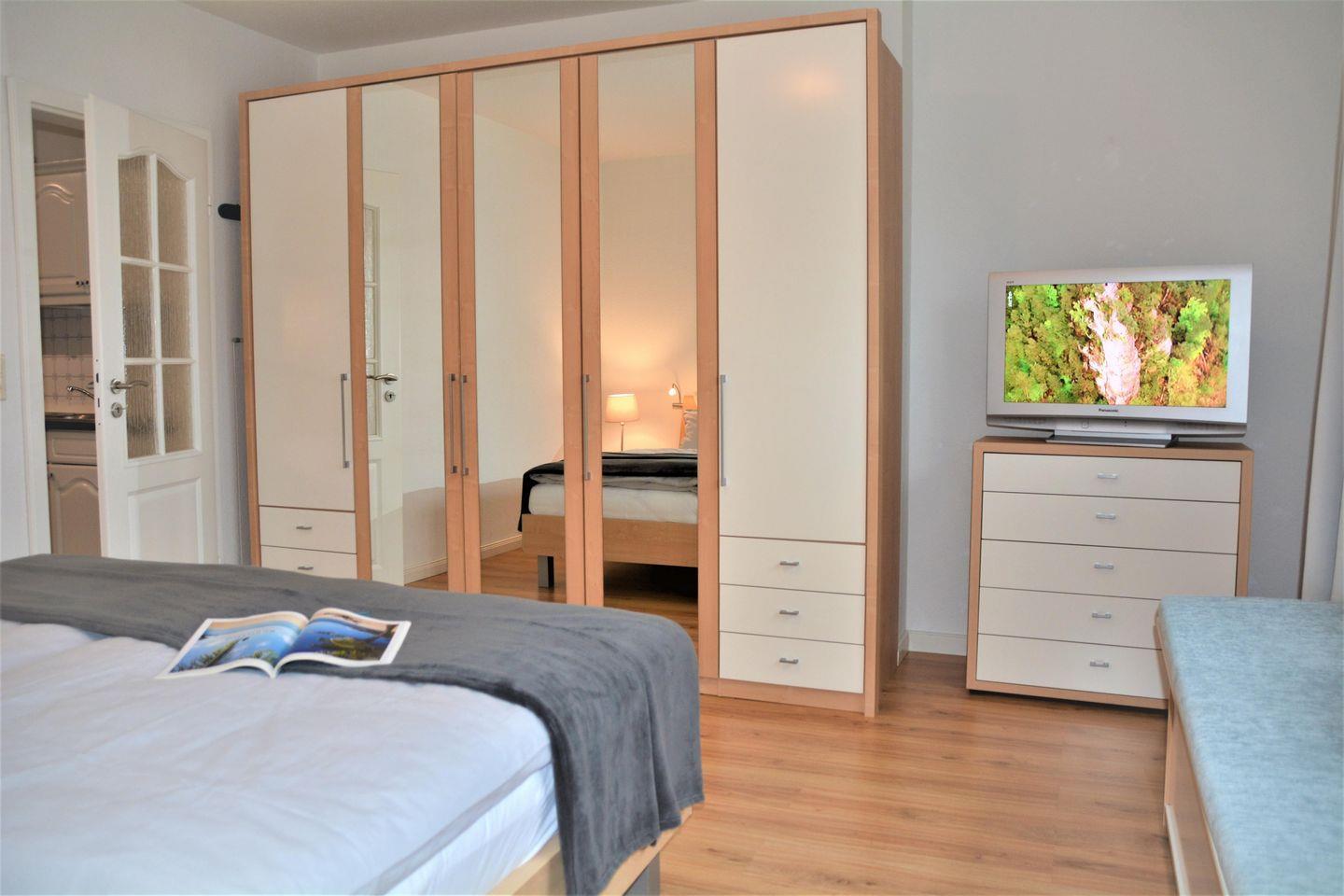 Doppelbett (je Matratze 200x90x51 cm), Lattenroste Kopf- und Fußteil höhenverstellbar, Kleiderschrank 5 türig mit großem Spiegel, Kommode, Sitztruhe, Kleiderstuhl, 2 Nachtschränke, Flachbild TV