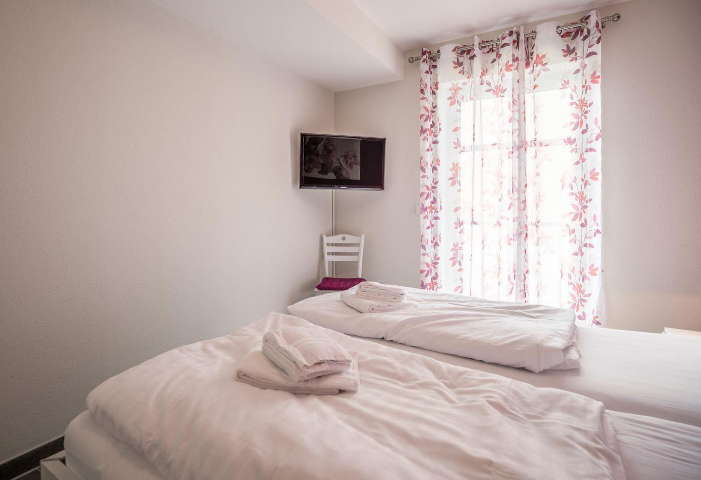 Doppelbett mit Komforthöhe (2 à 90cm x 200cm), Lattenrost verstellbar Kopf- und Fußteil, Nachtkonsolen, Spiegelschrank 2 türig, TV-Flachbild, Gardine