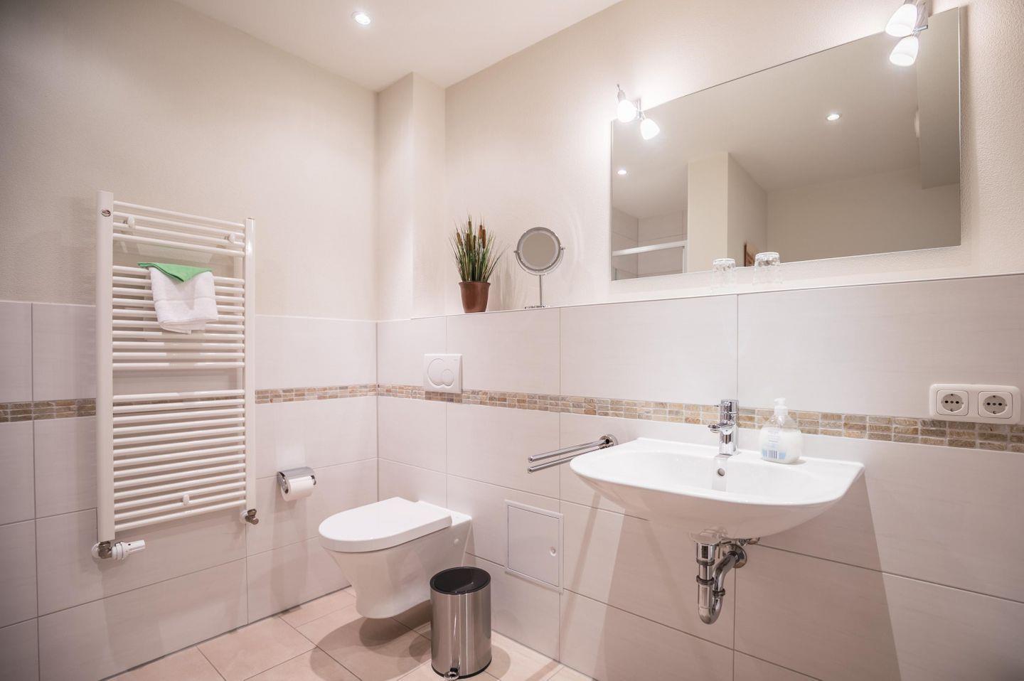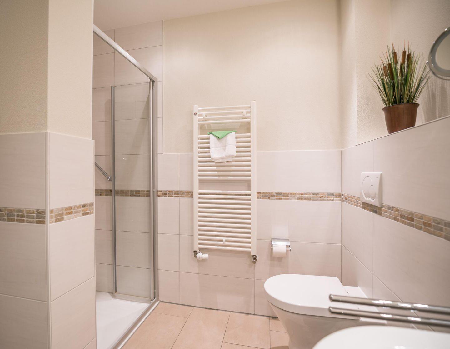 Dusche mit Haltegriff, WC, Ablageflächen, Fön, Waschbecken, Handtuchheizung, Lüfter, Kosmetikeimer, Hocker