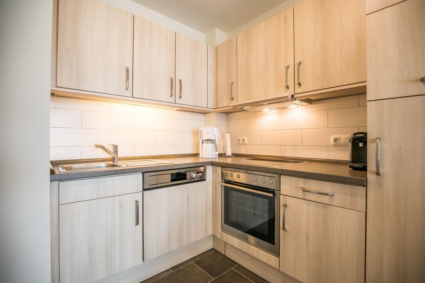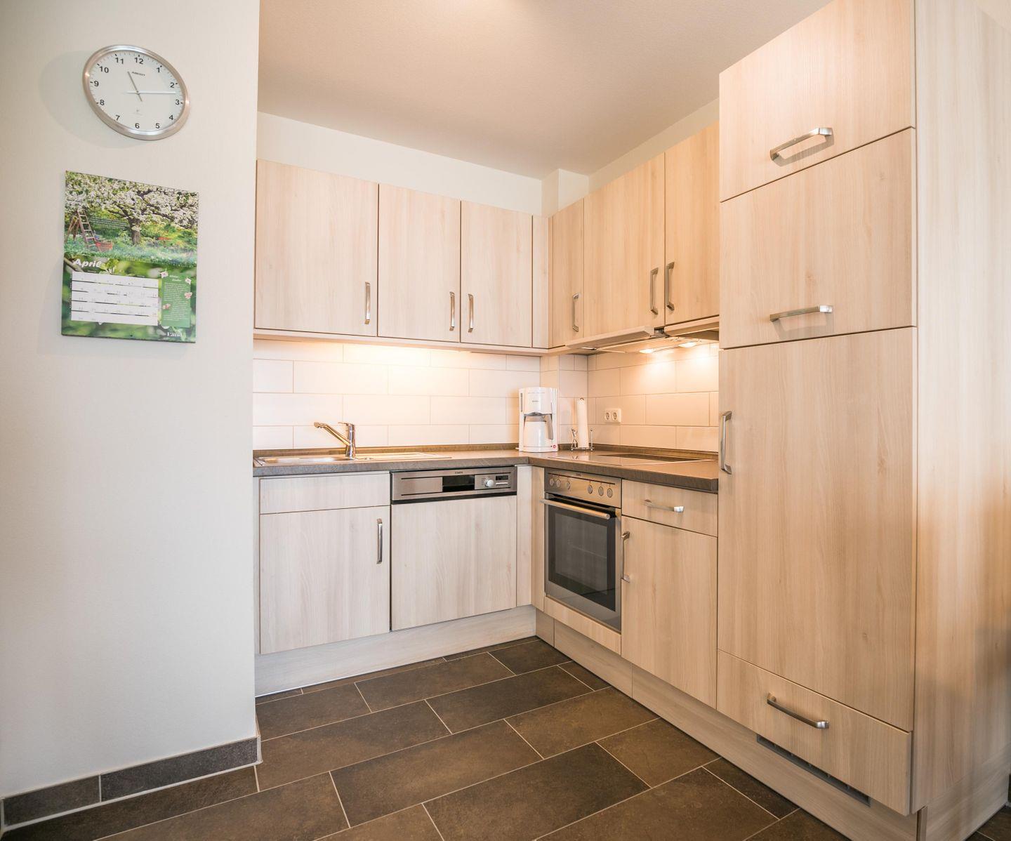 offene Küche, Cerankochfeld, Backofen, Geschirrspüler, Kühlschrank mit Gefrierfach, Microwelle, Wasserkocher, Eierkocher, Toaster, Kaffeemaschine (Filter), Tassimo Kapselmaschine, Küchenwaage