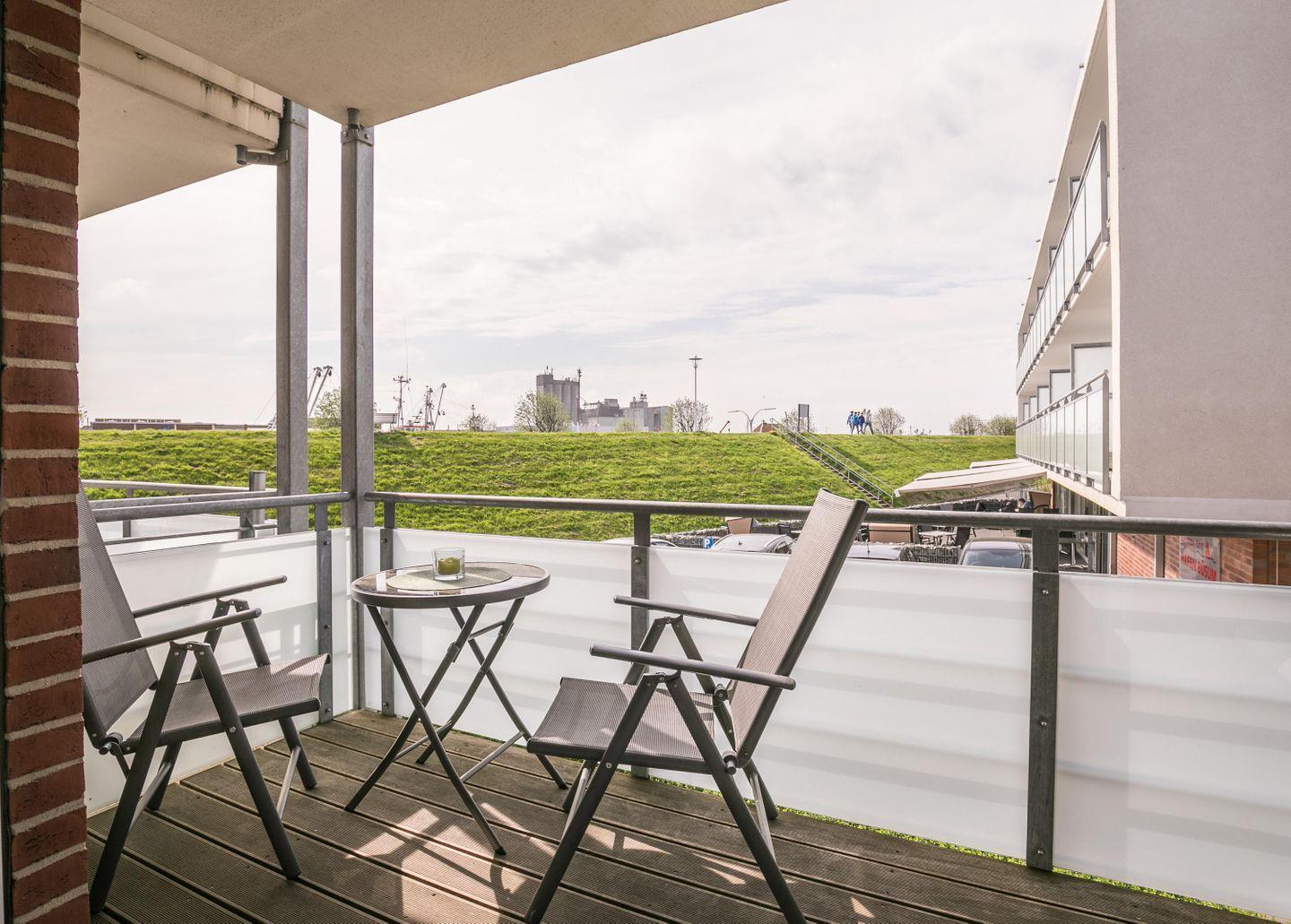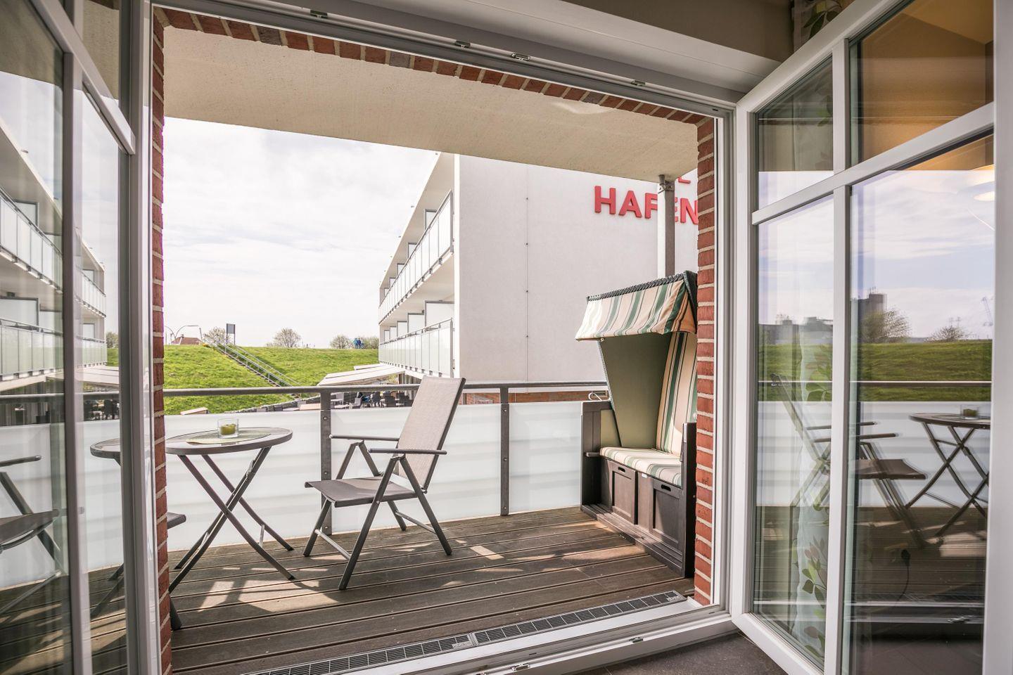 Vom Balkon aus haben Sie einen Blick Richtung Deich und Hafen!