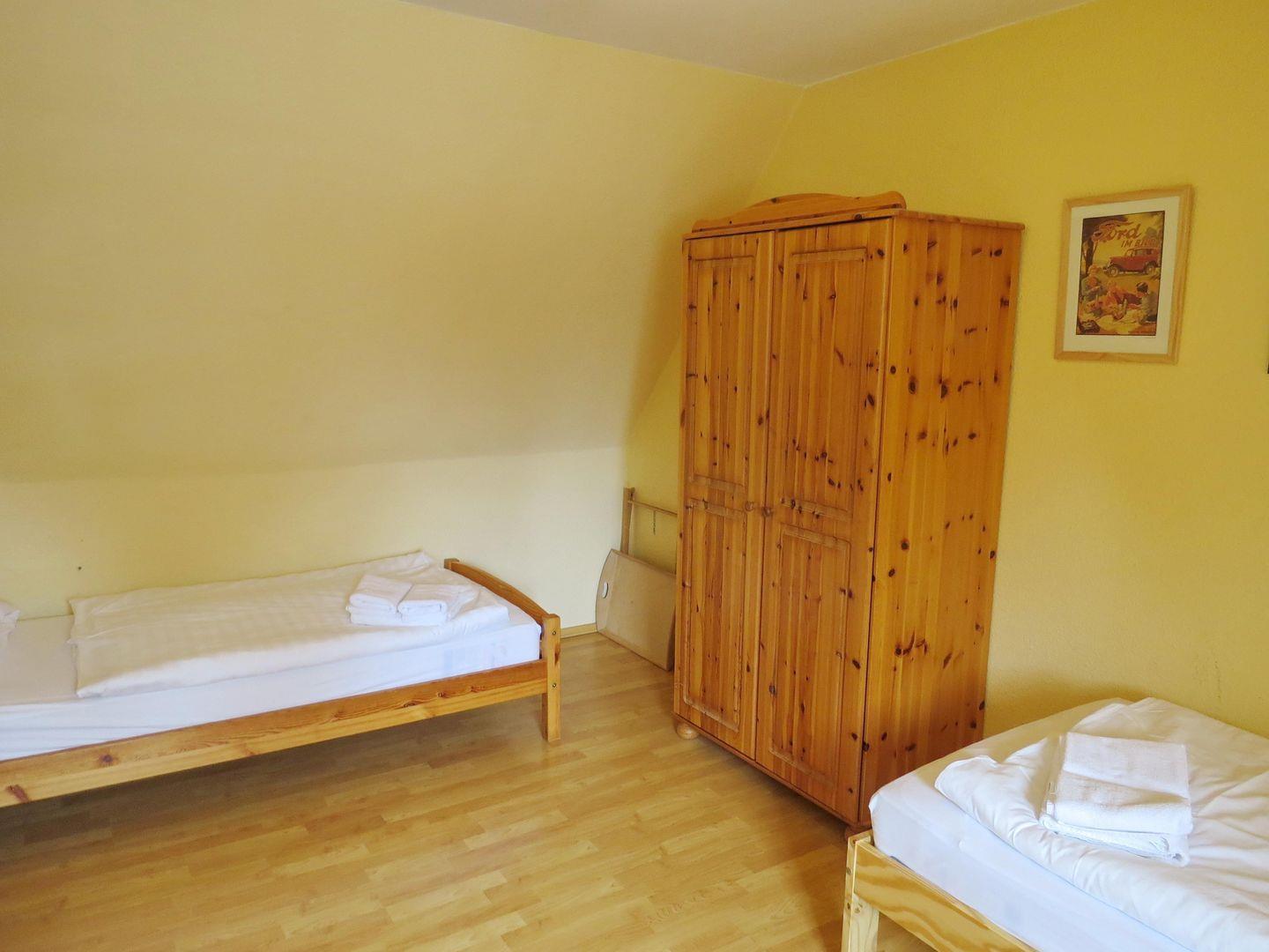 2 Einzelbetten (normale Größe 90x2m), 2 Nachtschränke, Kleiderschrank, kleiner Flachbildfernseher, Schreibtisch