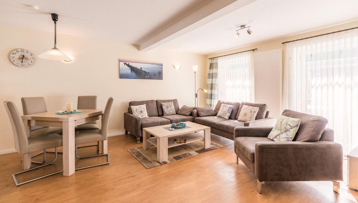 2 Zweisitzer, Sessel, Esstisch, 4 Stühle, Flachbild-TV, Stereoradio mit CD-Player, Balkon, Verdunklungsplisseeanlage