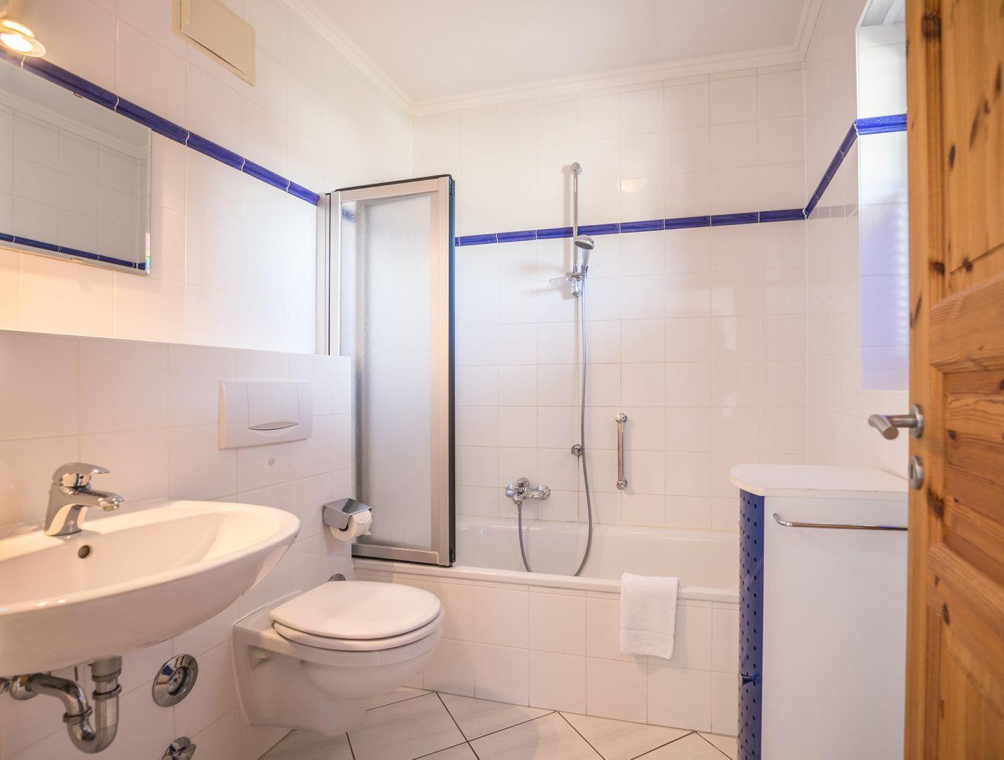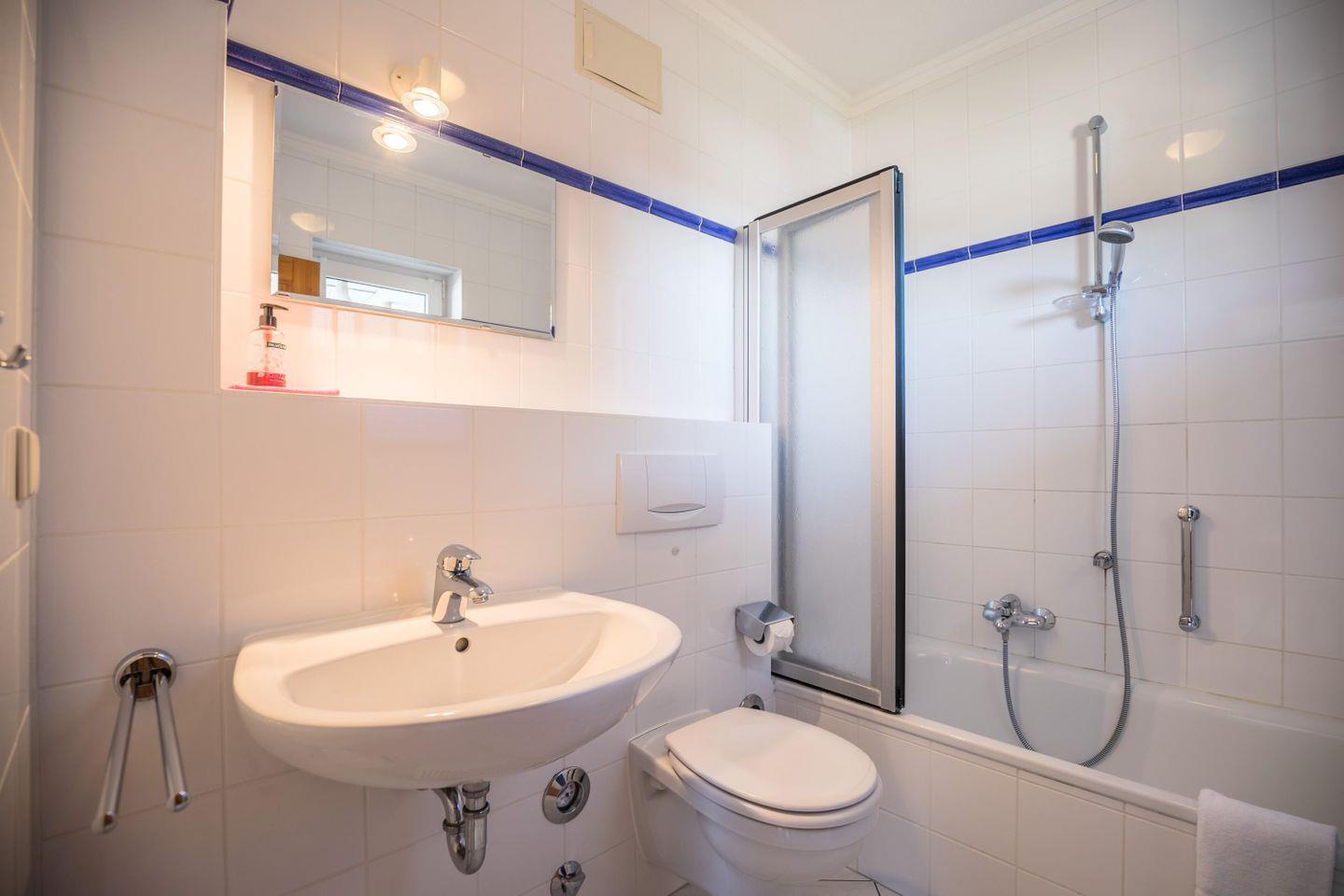 Badewanne mit Duschabtrennung, WC, Waschbecken, Spiegel, Ablage, Handtuchtrockner, Fenster mit Außenrollo und Plissee
