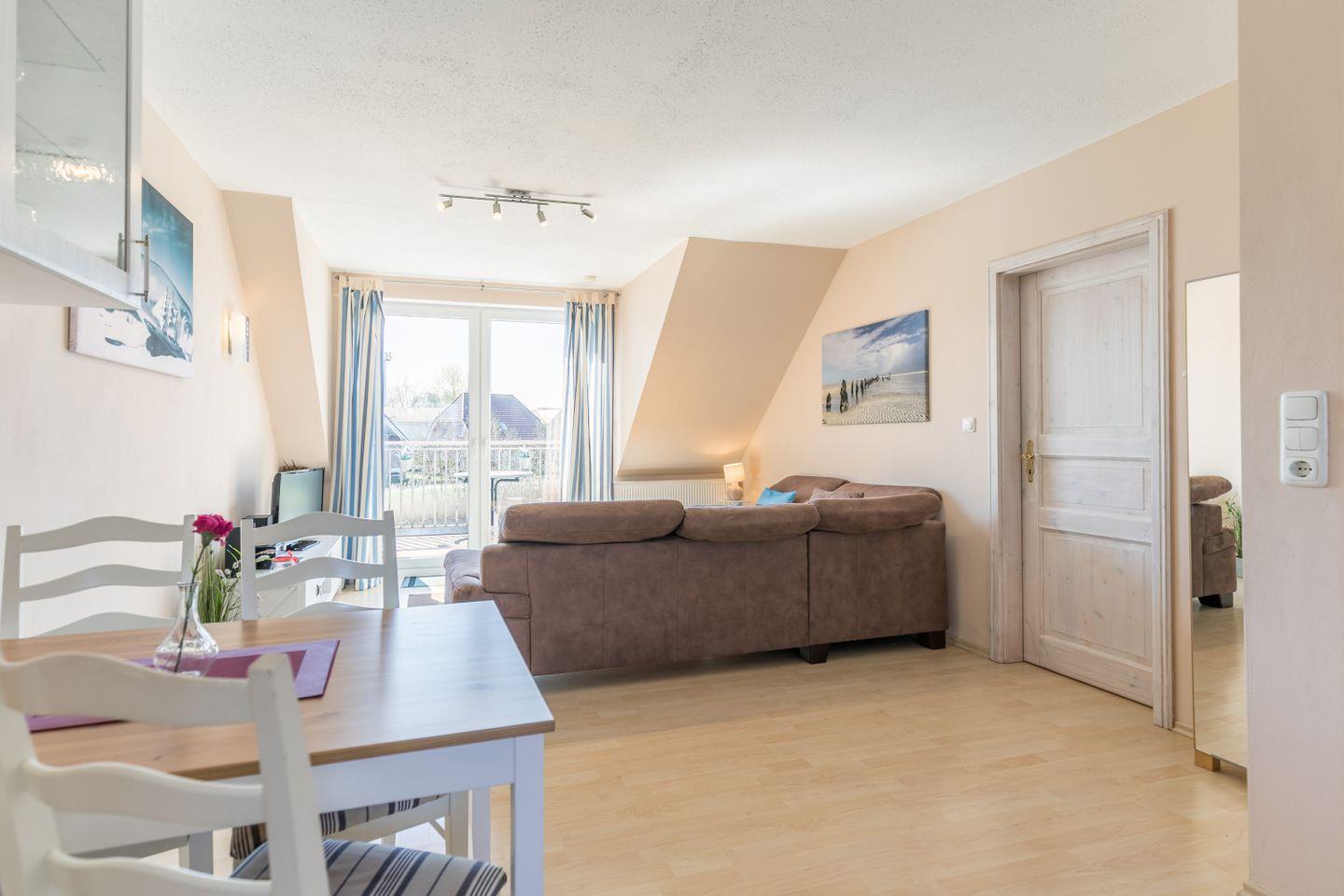 Schlafsofa, Flachbild-TV, CD-Player mit Radio, Esstisch mit Stühlen, direkter Zugang zum Sonnenbalkon, Laminatboden