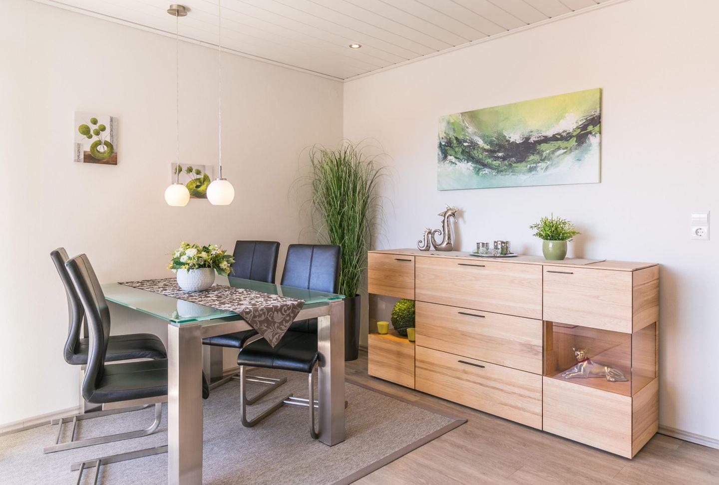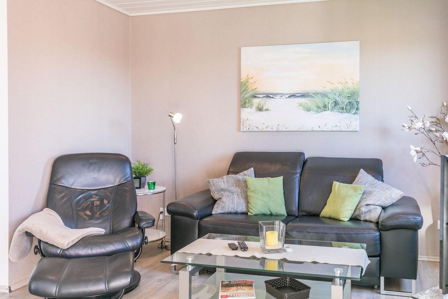 Leder-Schlafsofa, Stressless-Sessel mit Fußhocker, Essecke mit 4 Stühlen, Sideboard, Flachbildfernseher, Stereoanlage, Zugang zum Balkon