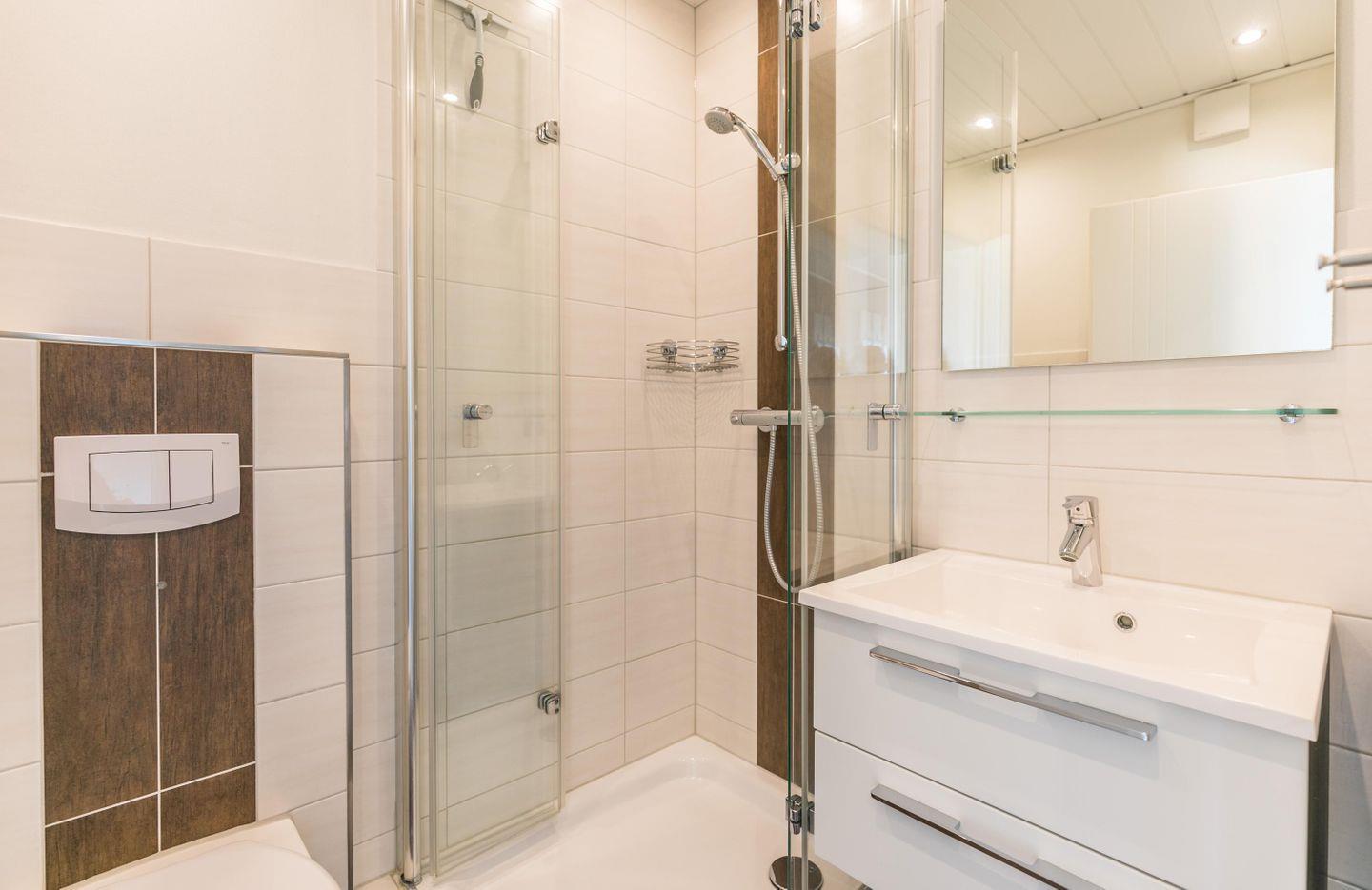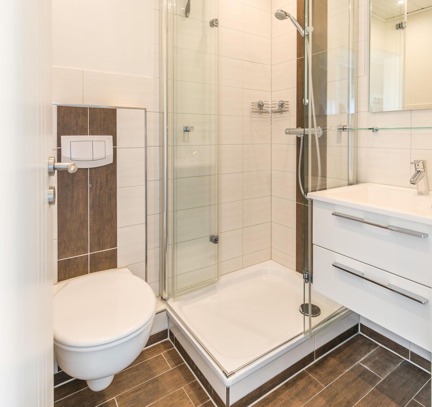 Dusche, WC, Waschbecken mit Unterschrank, Spiegel, Föhn, Handtuchtrockner