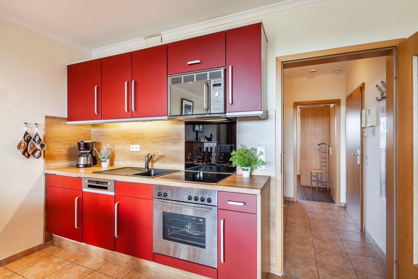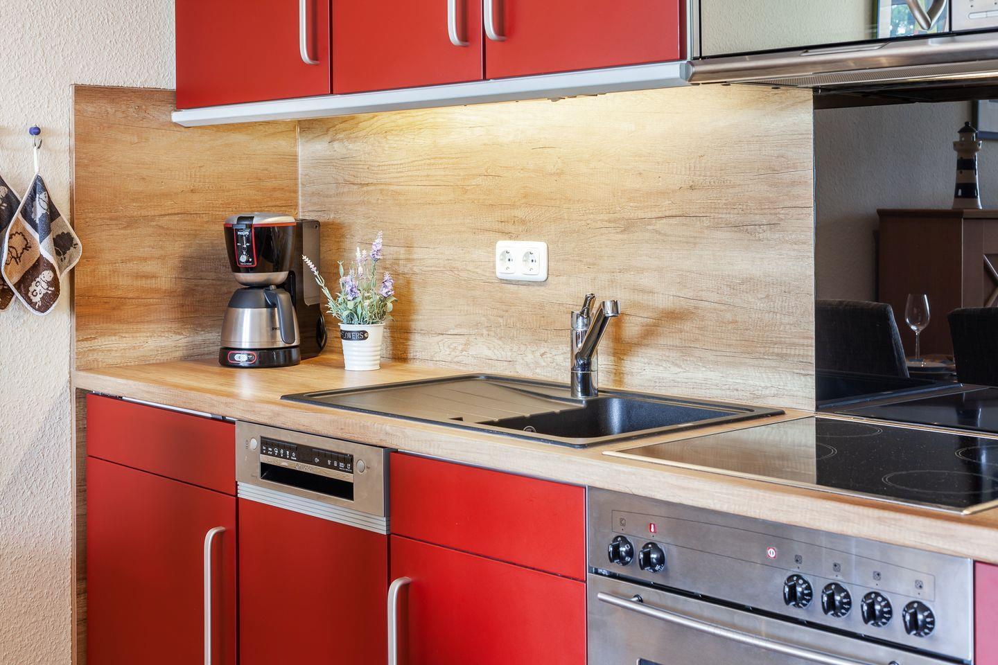 Küchenzeile im Wohnbereich, Geschirrspüler, Kühlschrank mit Gefrierfach, Cerankochfeld und Backofen, Mikrowelle mit Abluft, Kaffee-Kapselmaschine Nespresso, Wasserkocher, Allesschneider, Eierkocher, Toaster, Mixer und Mixstab usw.