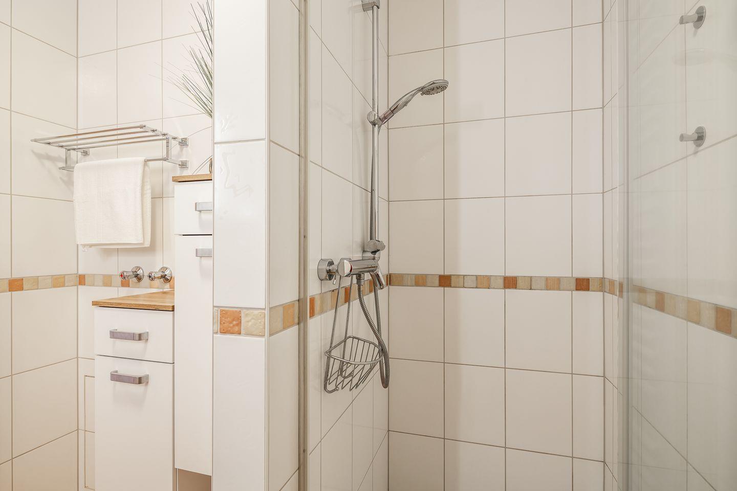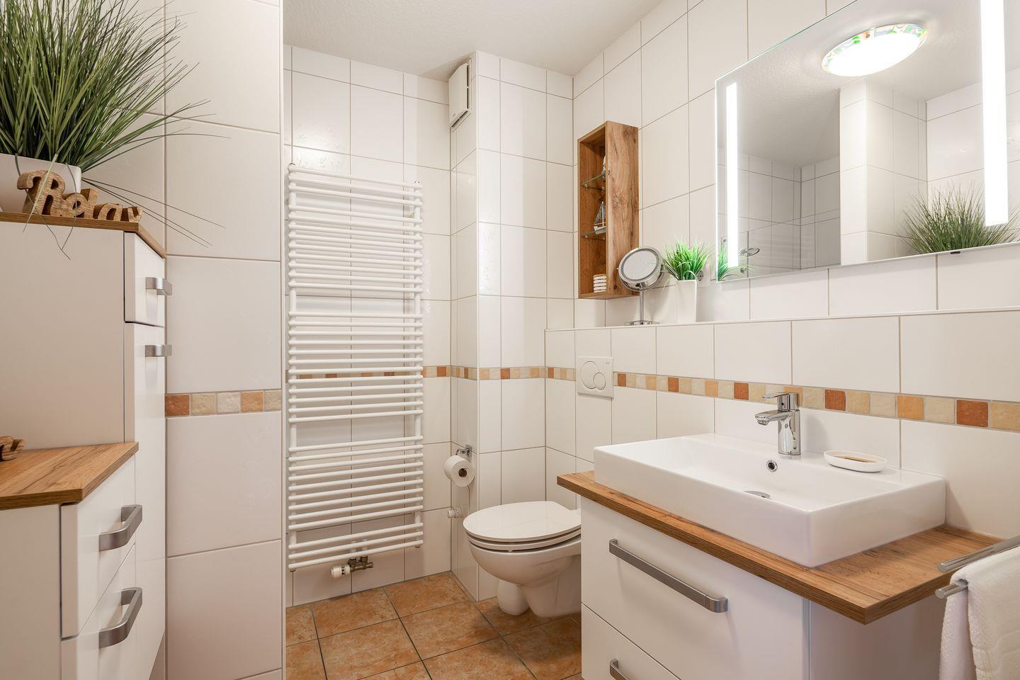 geräumiges Duschbad mit Bodeneinstieg, WC , großes Waschbecken, Fußbodenheizung und Handtuchwärmer, Föhn, Kosmetikspiegel und Ventilator