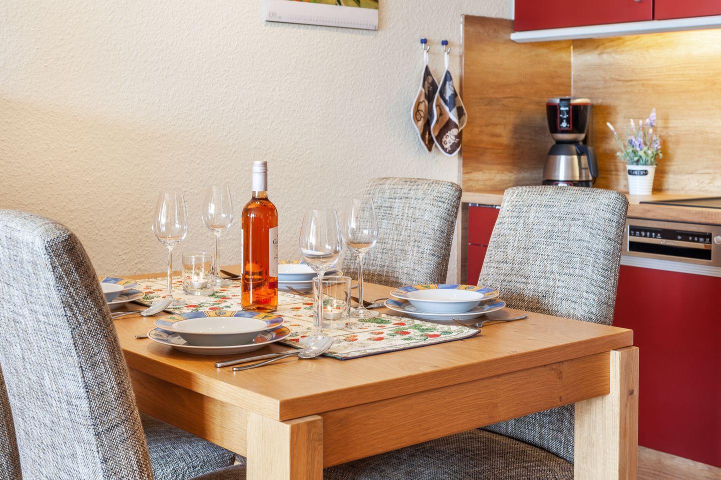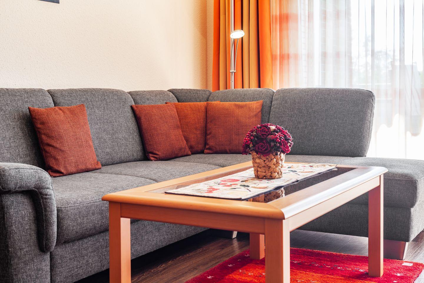Designfußboden in Holzoptik und bequemes Ecksofa mit Federkern, Glastisch und Glasvitrinen mit Beleuchtung, Doppelgardinen zum Zuziehen, DVD-Player, Radio, TV-Flachbildschirm mit Kabelanschluss. Ausziehbarer Esstisch mit 4 Stühlen, Bücher und Gesellschaftsspiele