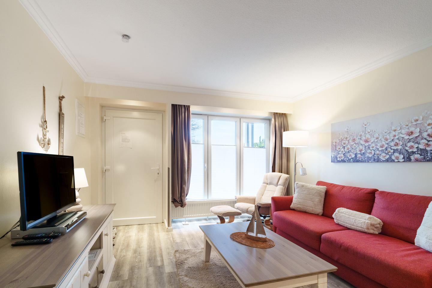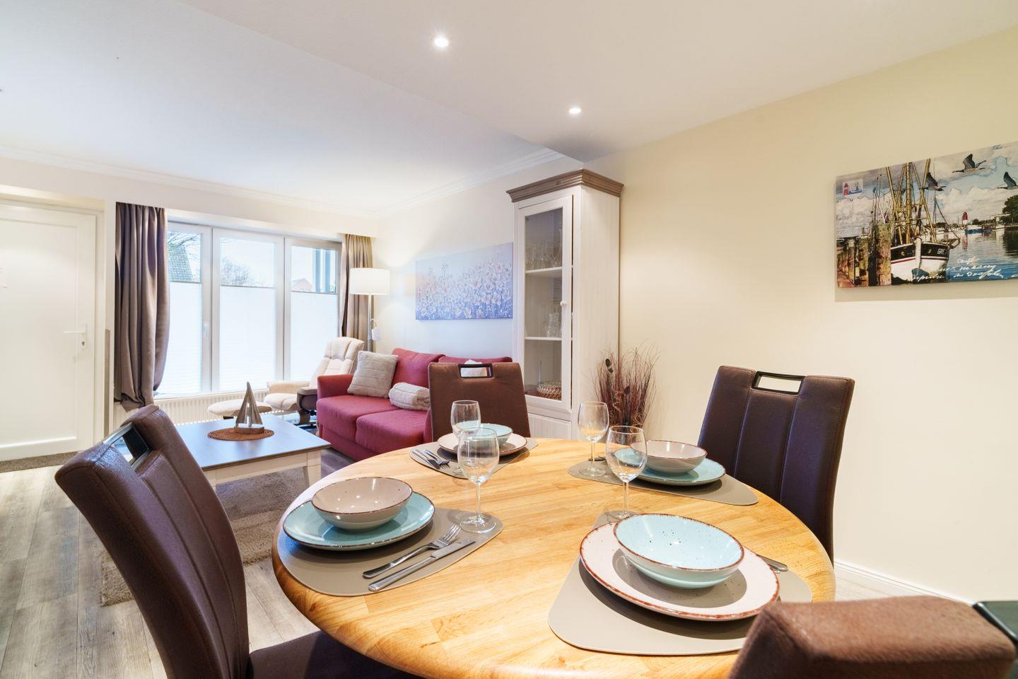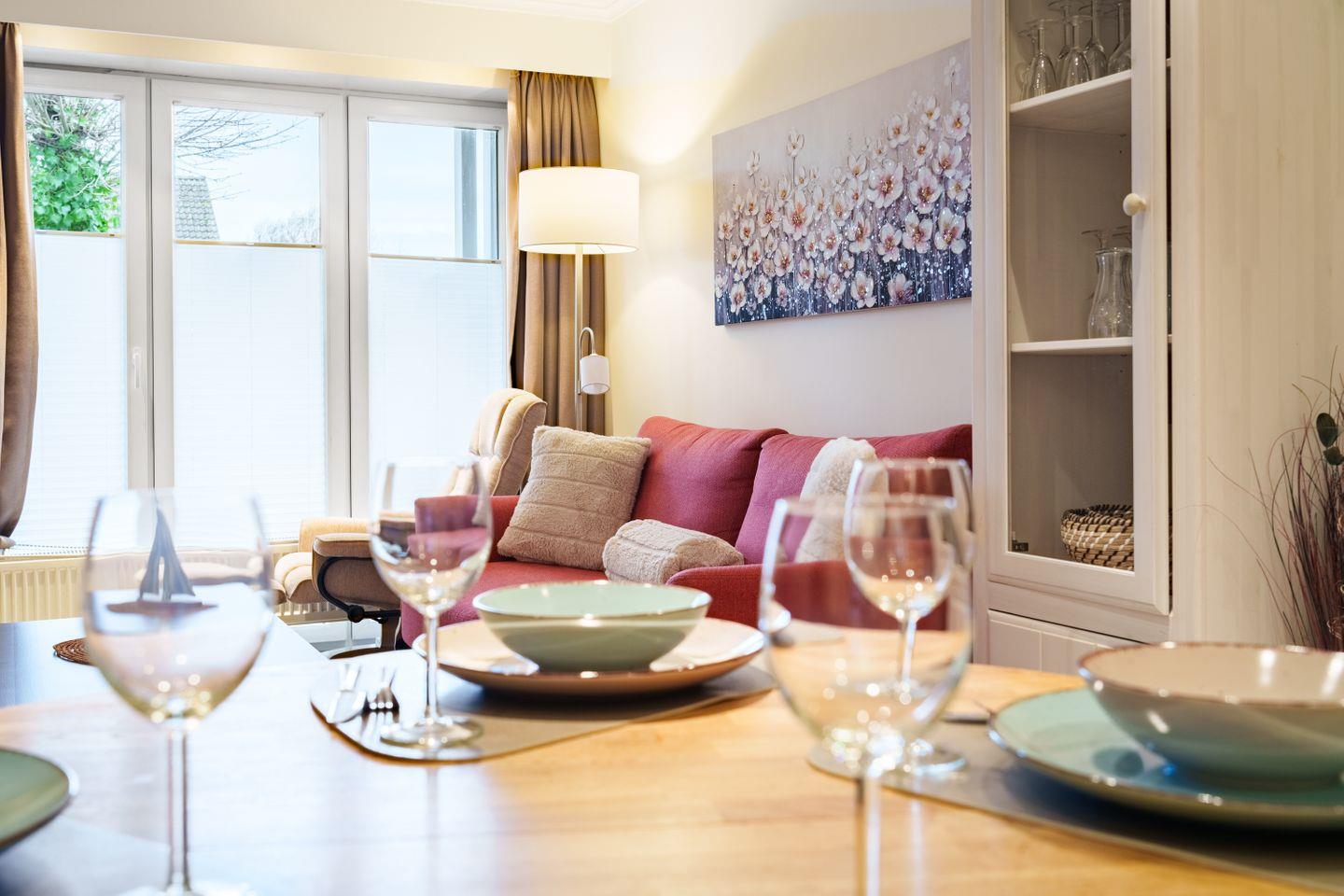 Schlafsofa, Relax-Sessel mit Fußhocker, Flachbild TV, Blu-Ray-Player, Esstisch mit 4 Stühlen, Plissee und Verdunkelungsvorhang, Zugang zur Westterrasse