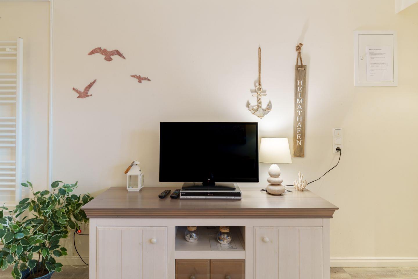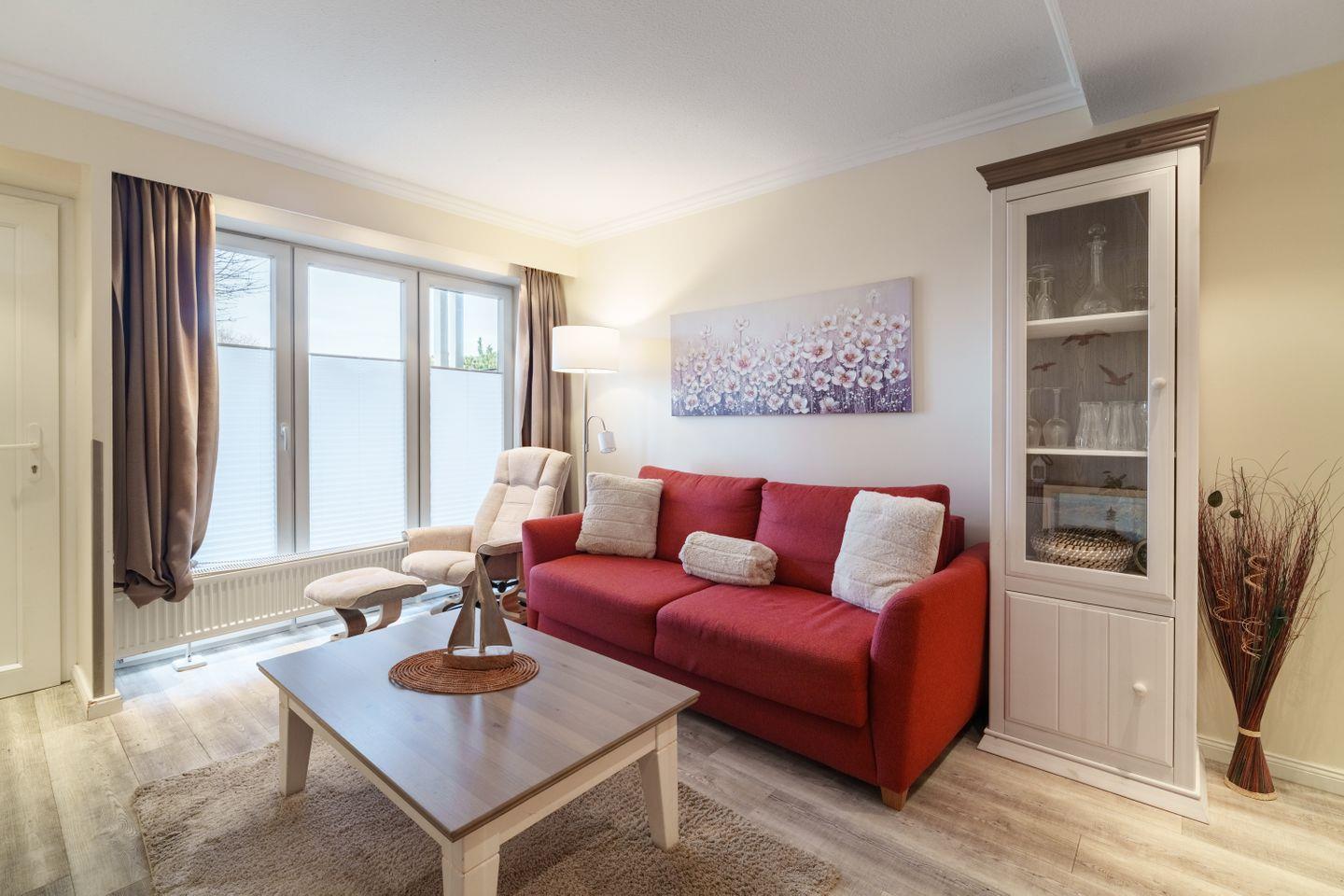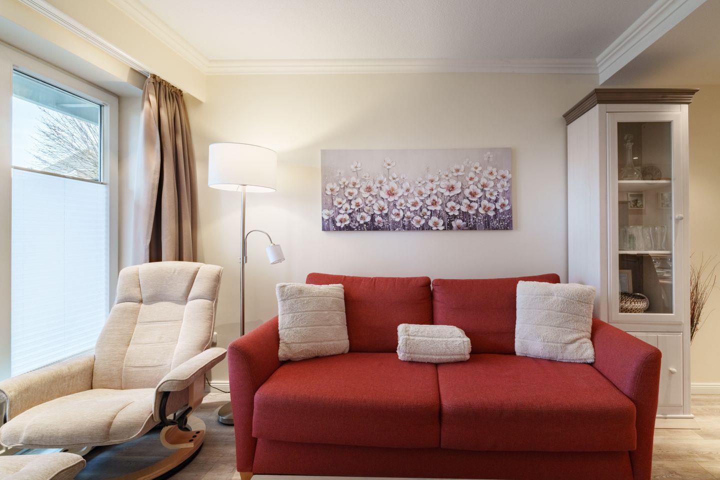 Schlafsofa, Relax-Sessel mit Fußhocker, Flachbild TV, Blu-Ray-Player, Esstisch mit 4 Stühlen, Plissee und Verdunkelungsvorhang, Zugang zur Westterrasse
