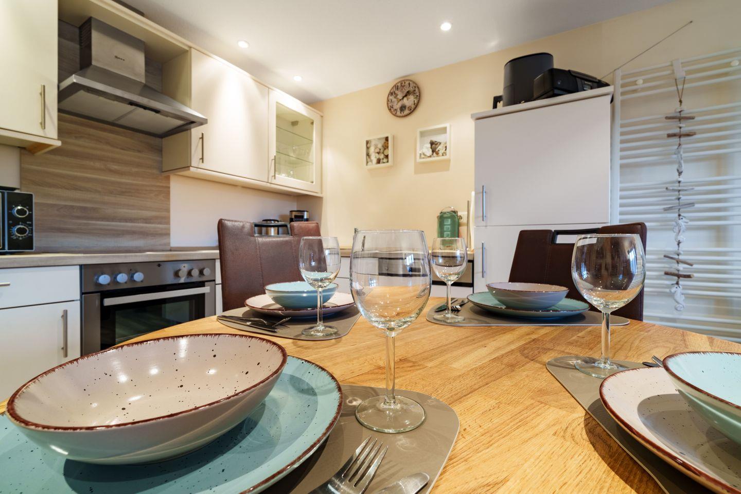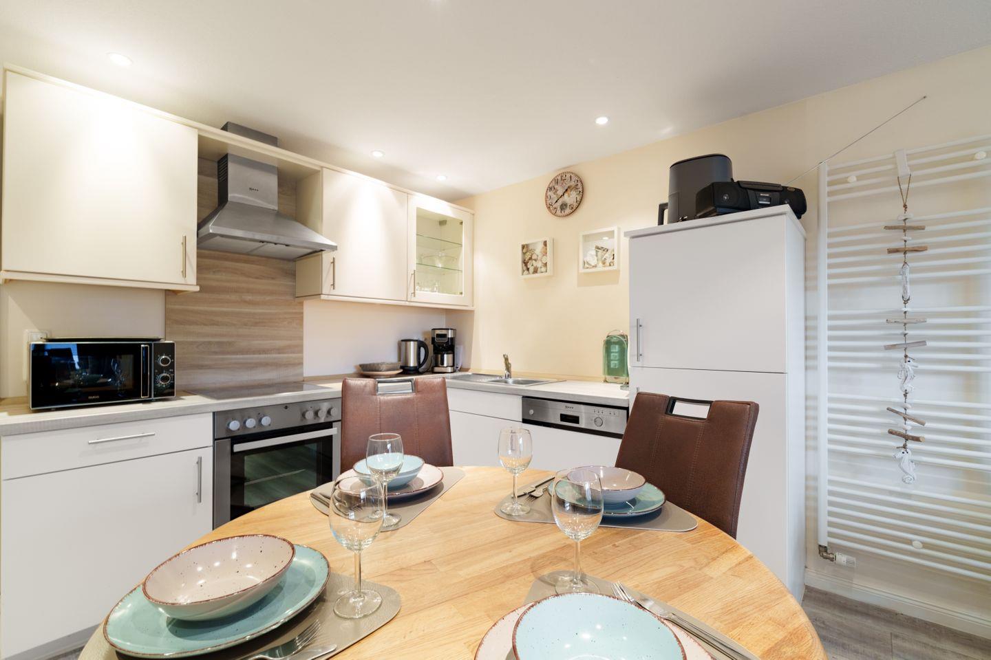 Ceran-Kochfeld, Backofen, Geschirrspüler, Kühlschrank mit Gefrierfach, Wasserkocher, Toaster, Eierkocher, Kaffeemaschine + Senseo Kaffeepad-Maschine, Heißluftfritteuse