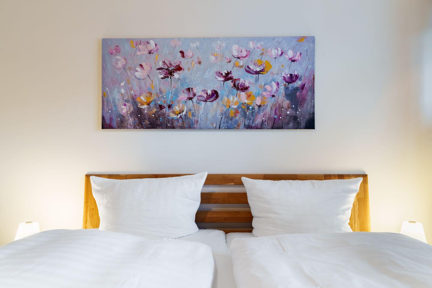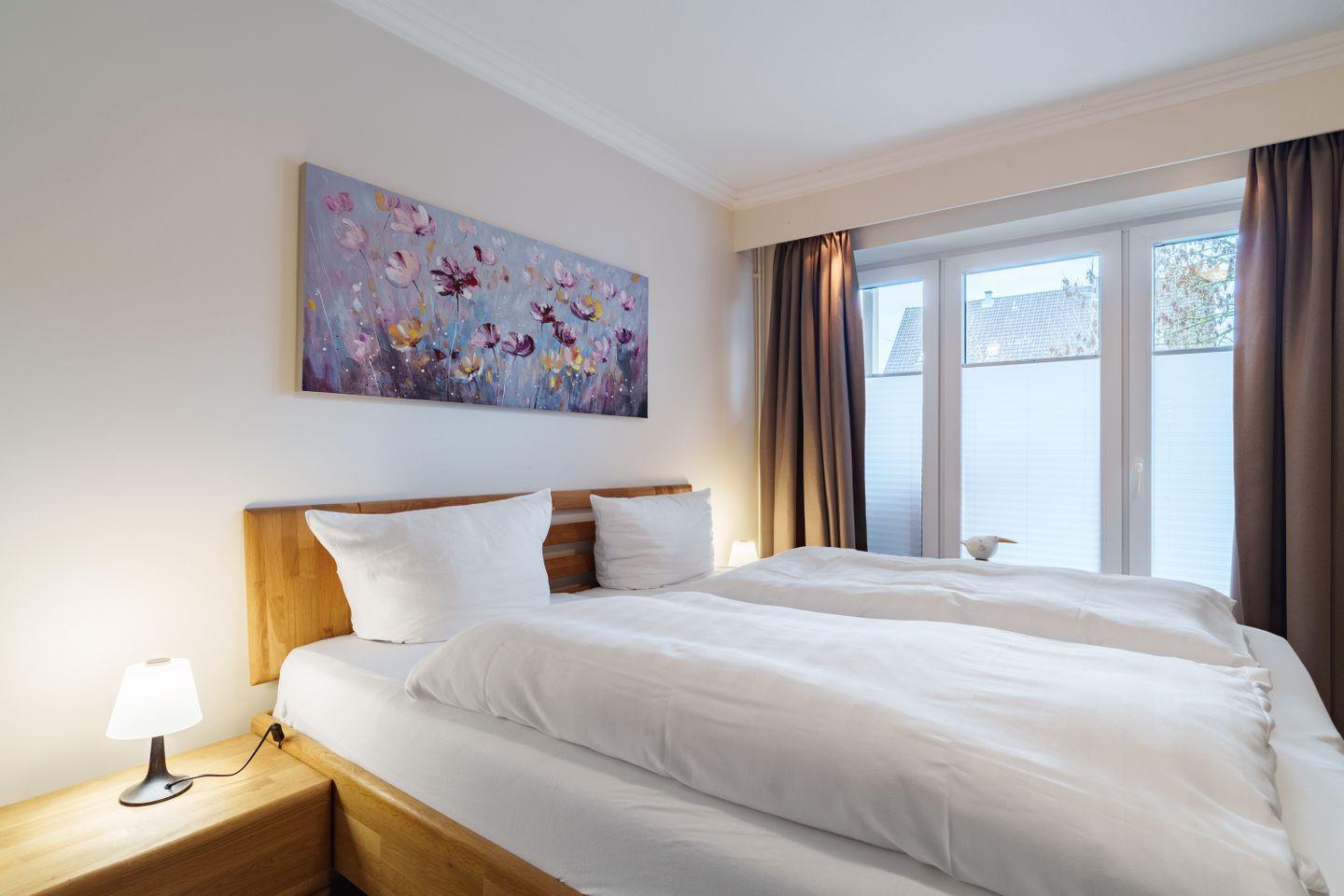 Doppelbett mit getrennten Matratzen (Komfort-Einstiegshöhe 65cm), Kleiderschrank 3-türig, Kommode, Flachbild TV, Nachtschränke, Korbsessel, Zugang zur Ost-Terrasse, Plissee und Verdunkelungsvorhang, Zugang zur Ostterrasse
