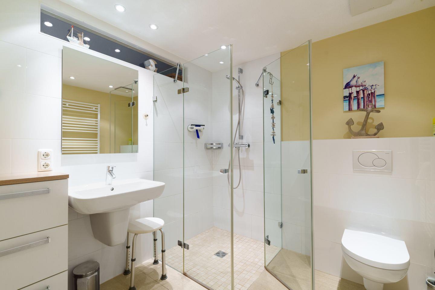 Ebenerdige Dusche, WC, Schminkspiegel, Duschhocker, Fön, Handtuchheizung, Lüfter, Spiegel