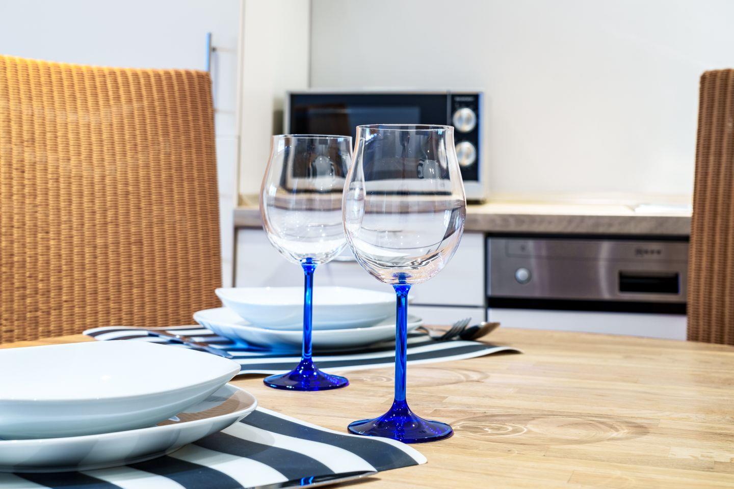 Ceranfeld, Backofen, Geschirrspüler, Kühlschrank mit Gefrierfach, Mikrowelle, Kaffeemaschine, Toaster, Wasserkocher, Eierkocher