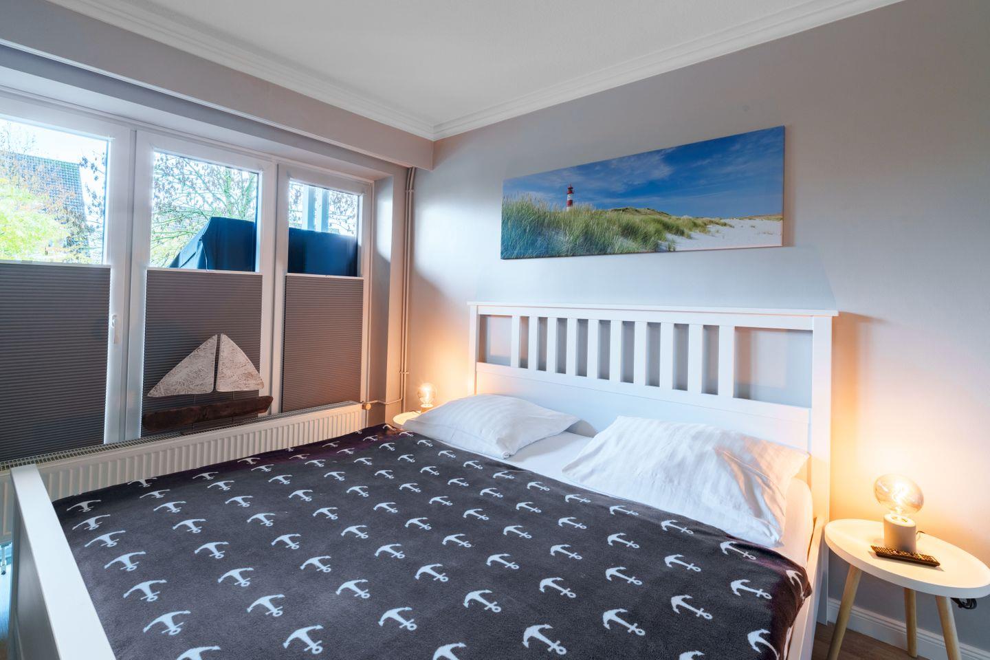 Doppelbett (getrennten Matratzen) mit 2 Nachtkonsolen, Lattenrost Kopf- und Fußteil höhenverstellbar, Flachbild-TV, 3türiger Kleiderschrank, Kommode, Zugang zur Ostterrasse, Plissees und Verdunkelungsvorhang, Korbsessel
