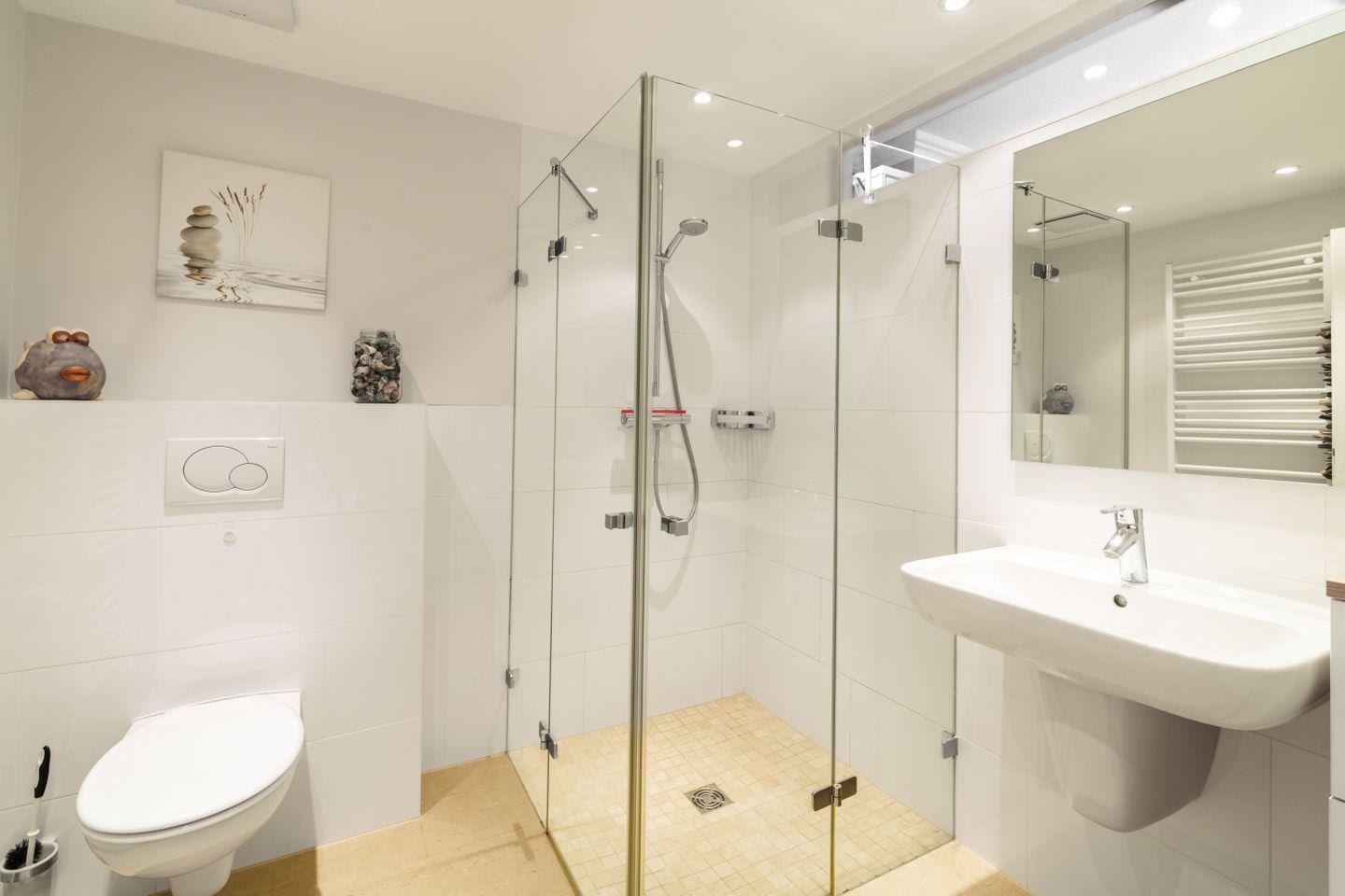 Das Badezimmer bietet modernen Komfort und ist mit einer bodengleichen Duschkabine ausgestattet, die den Zugang erleichtert.