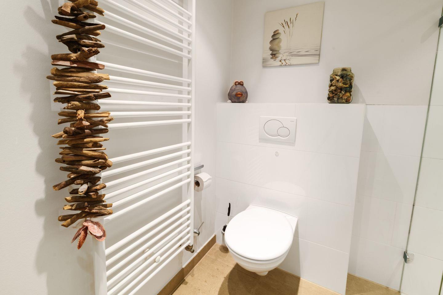 Duschkabine bodengleich, WC, Fön, Waschtisch mit Ablage, Hocker, Lüfter, Handtuchtrockner
