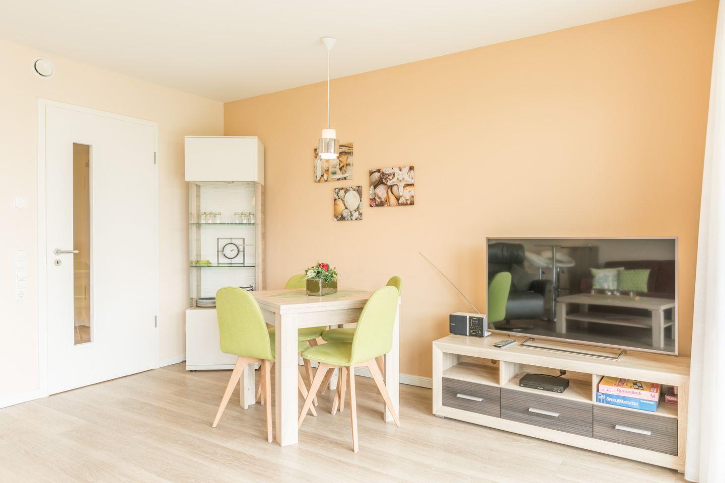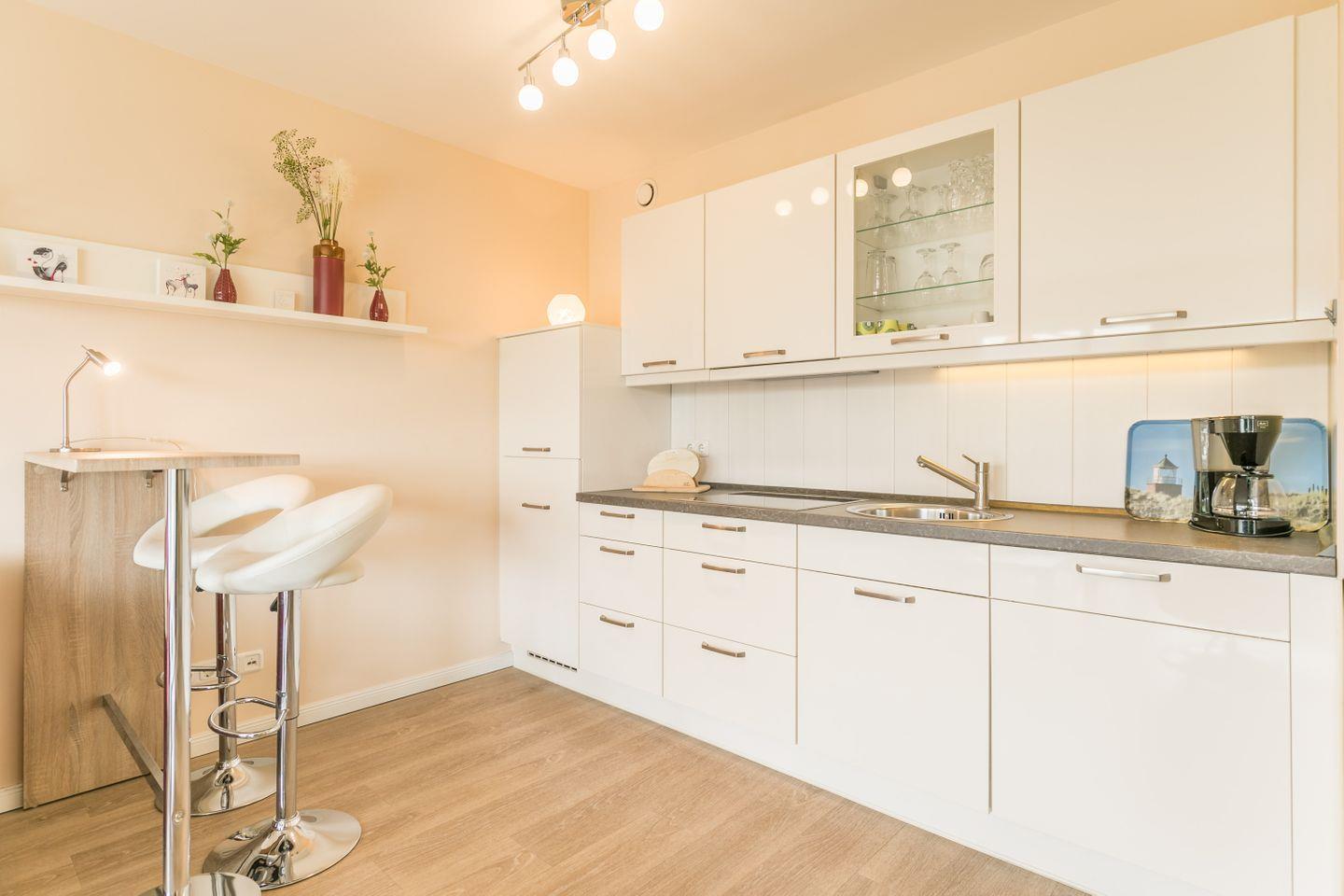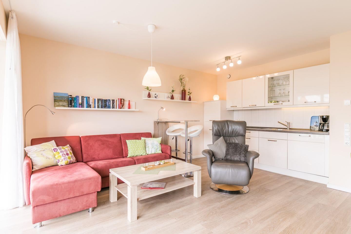 Harmonische Farben in der offenen Wohnküche sorgen für einen spürbaren Charme der Wohnung. Auf dem gemütlichen Schlafsofa und dem Relaxsessel können Sie es sich abends gemütlich machen und mit etwas Glück sowie niedrigem Baumstand auch auf den Hafen von Büsum blicken.