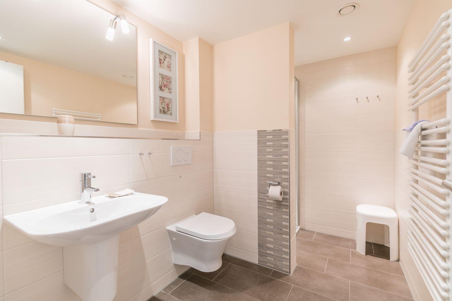 WC, Dusche, Spiegel, Handtuchwärmer, Föhn, Hocker, Abluft