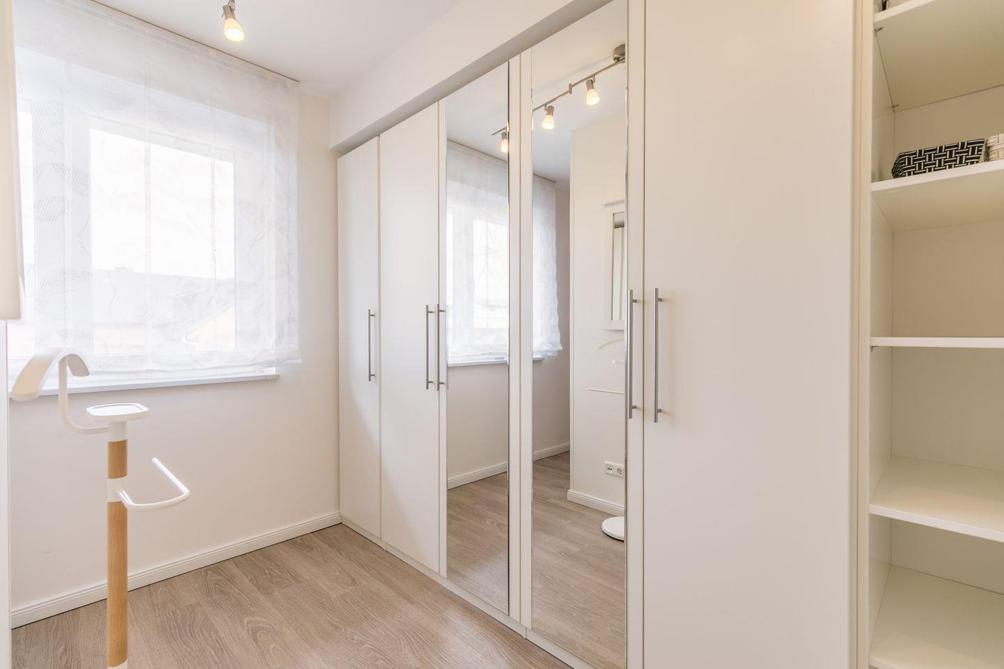 Im Schlafzimmer ist der Ankleidebereich von einer raumteilenden Wand getrennt.