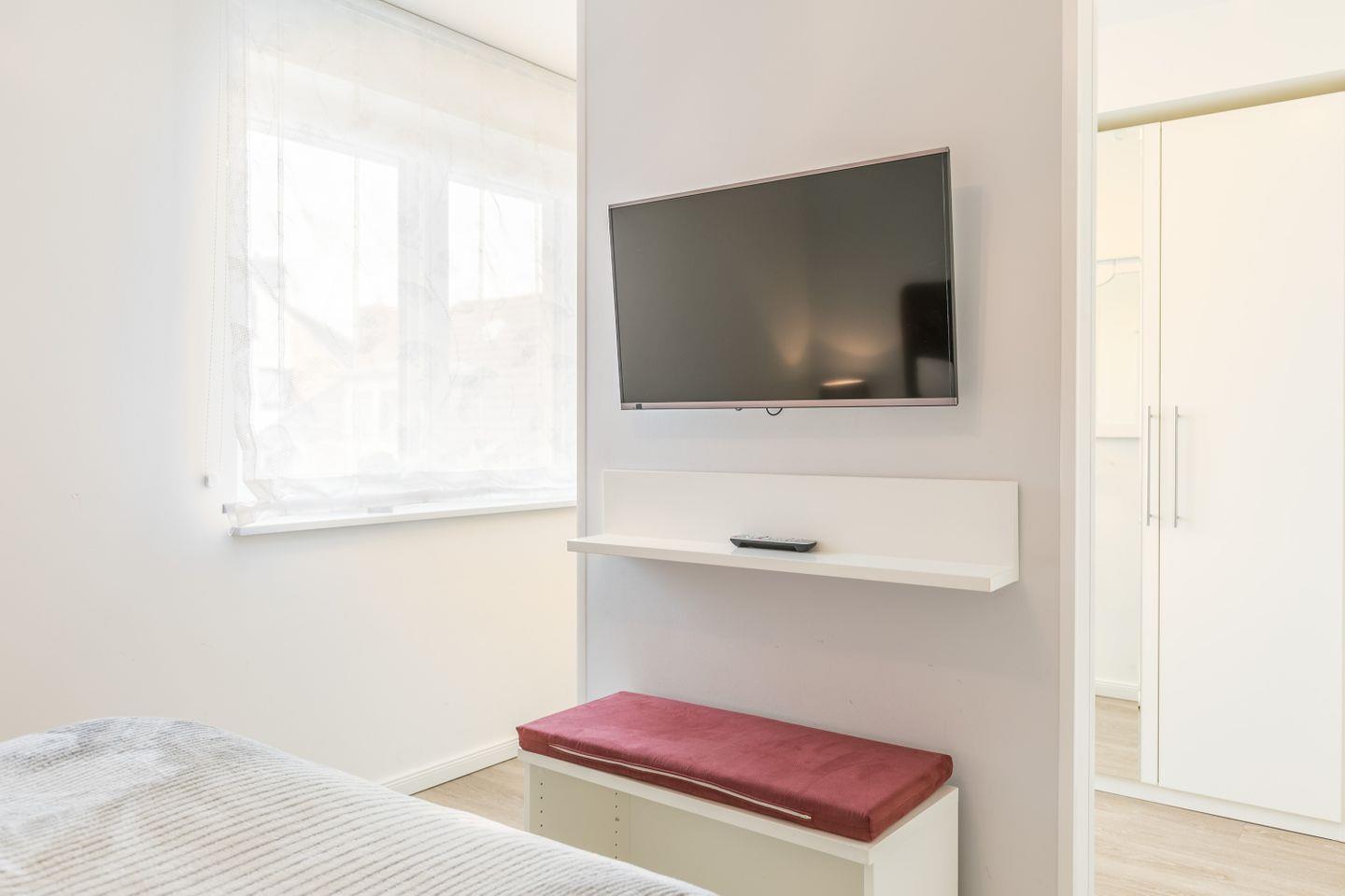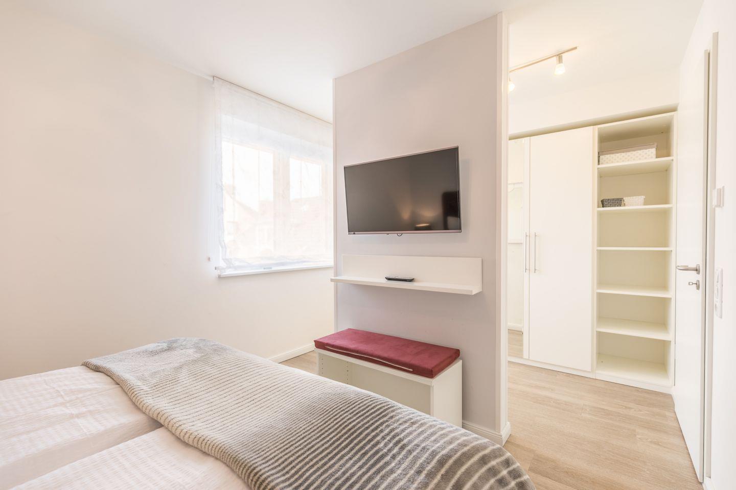 Boxspringdoppelbett (2 getrennte Matratzen a 2,00m x 0,90m), großer Kleiderschrank, Spiegel, Nachtische mit Lampen, Flachbild-TV, Außenrollläden, Hocker