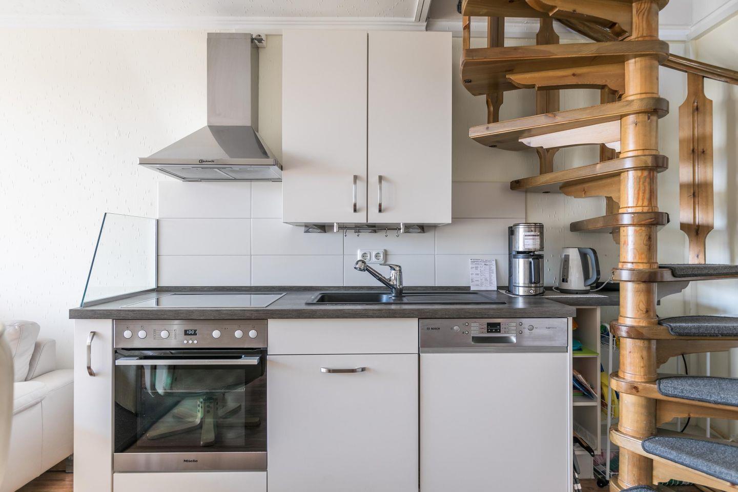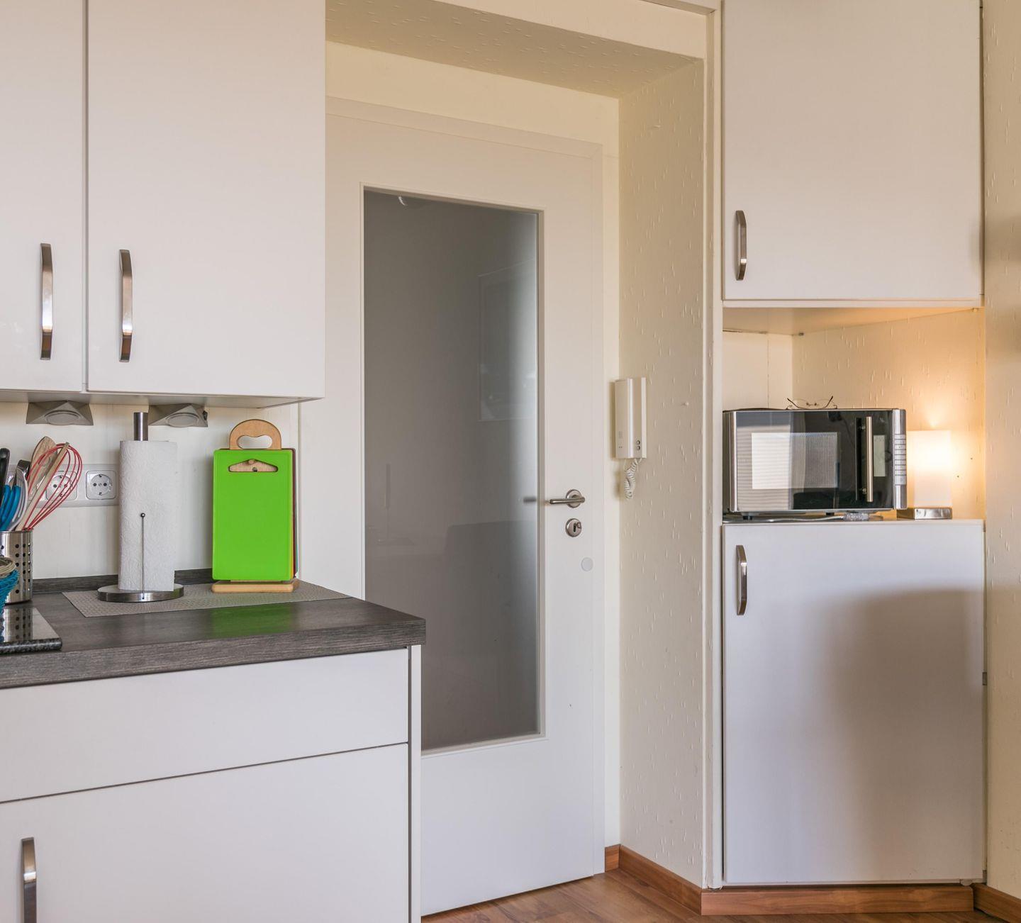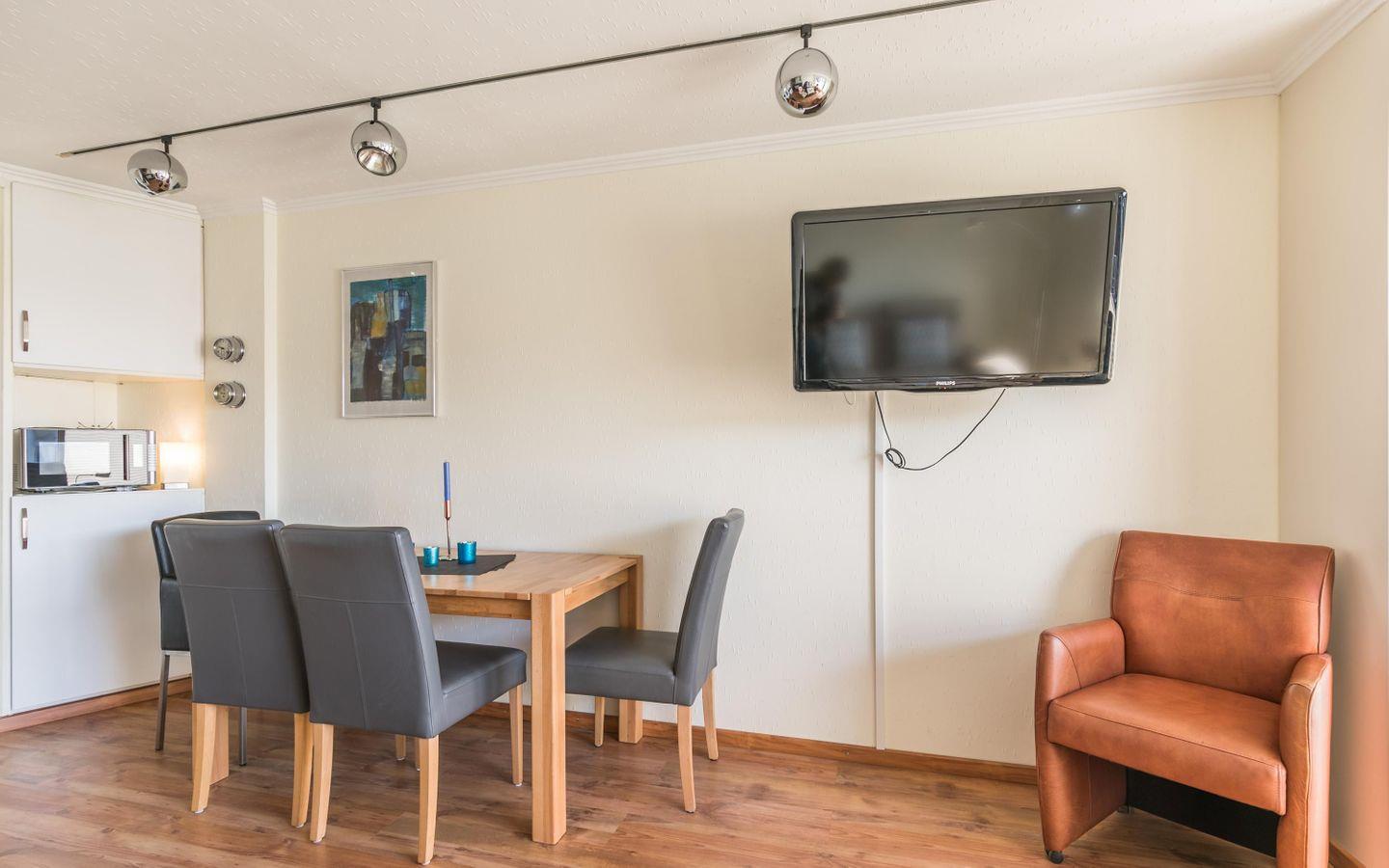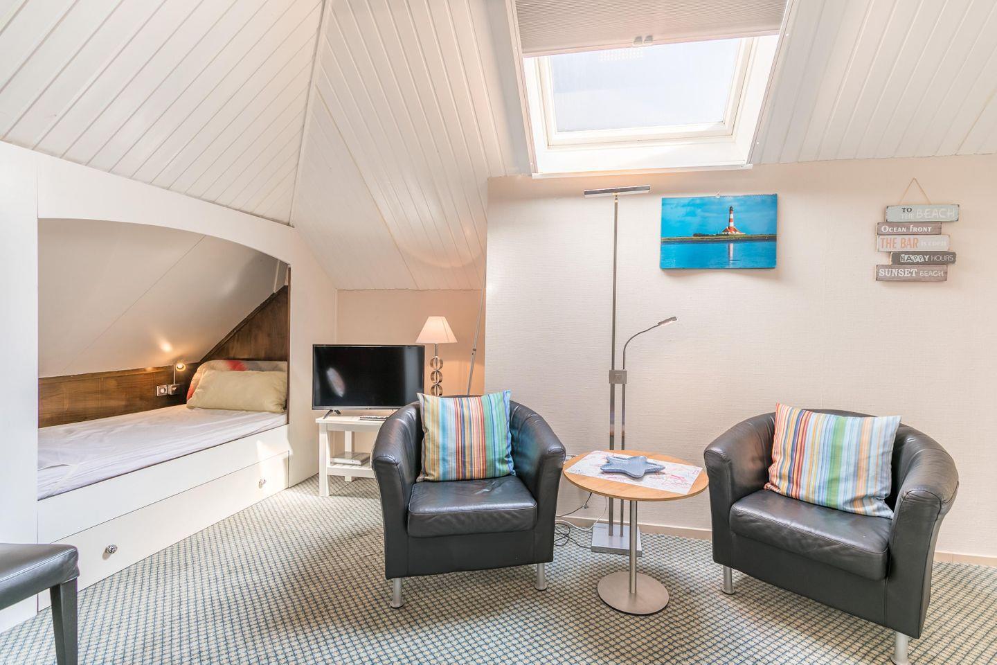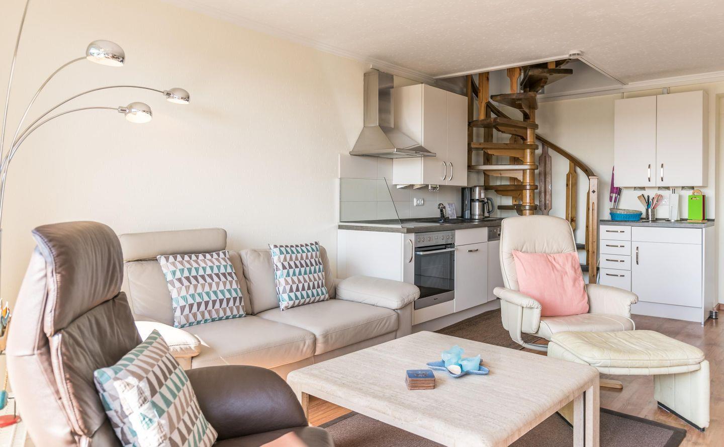 In dem etwa 26m² großen Wohnbereich mit integrierter Küche, Essplatz und einer gemütlichen Sofaecke finden 4 Personen ausreichend Platz. Vom Wohnbereich haben Sie Zugang zum Balkon mit Terrassenmöbeln. Genießen Sie den seitlichen Meerblick und beobachten Sie das Wattenmeer und die ein- und ausfahrenden Schiffe an der Hafenmole. Durch die Südost-Ausrichtung können Sie vom Frühstück bis zum Kaffee trinken in der Sonne sitzen.