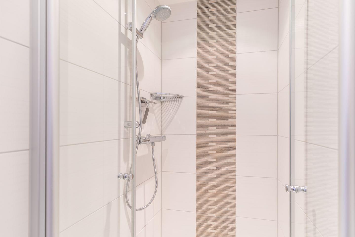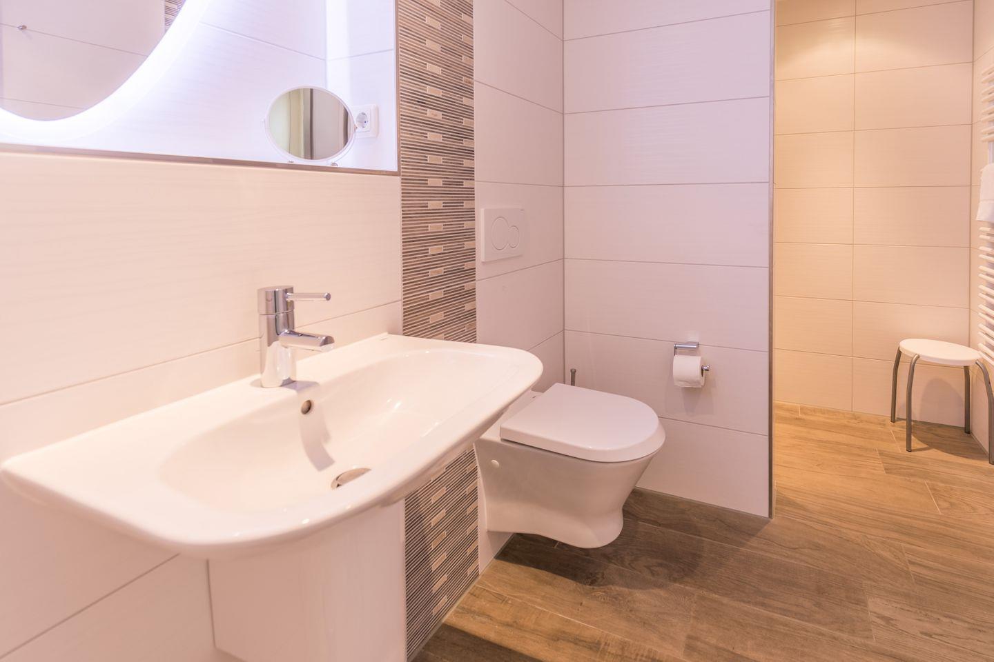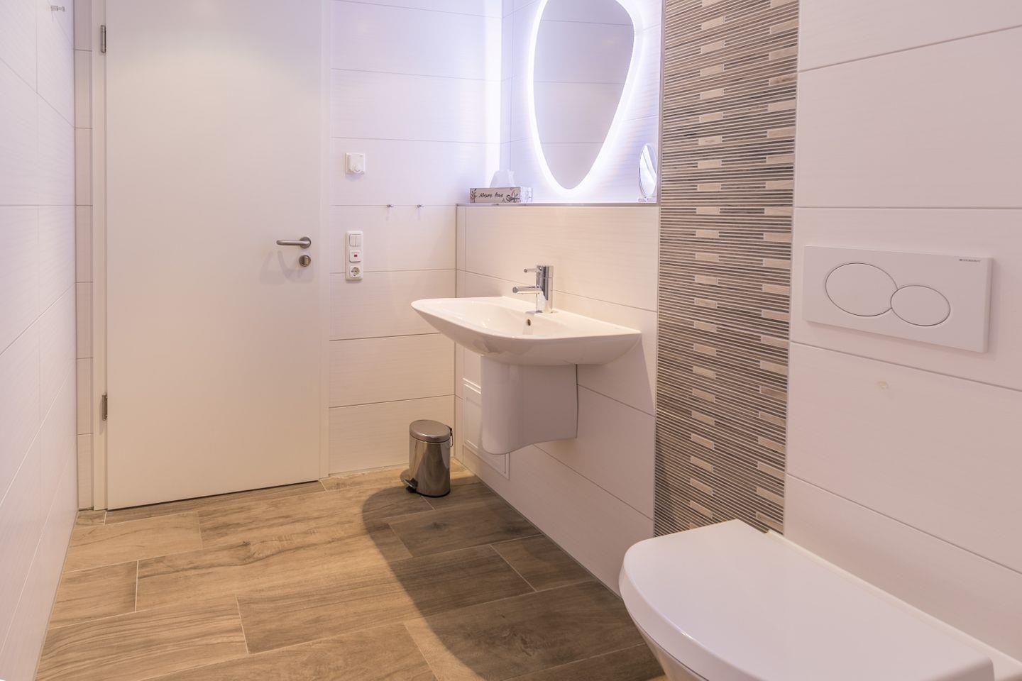 Bad: Dusche, WC, beleuchteter Spiegel, Handtuchwärmer, Fön, Abluft, Duschhocker, Kosmetikspiegel