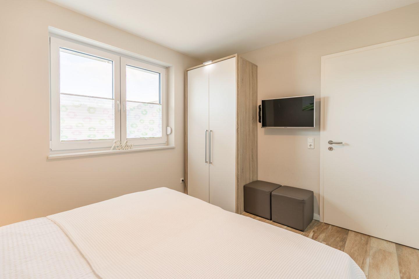 Doppelbett (2x 0,90mx2m), Kleiderschrank, Nachttische, Nachttischlampen, Hocker, Flachbild-TV, Außenjalousie, Insektenschutz