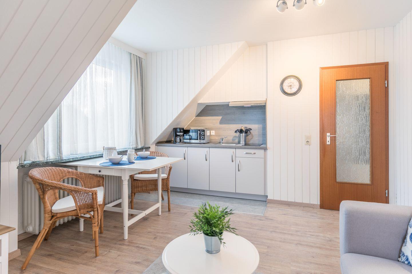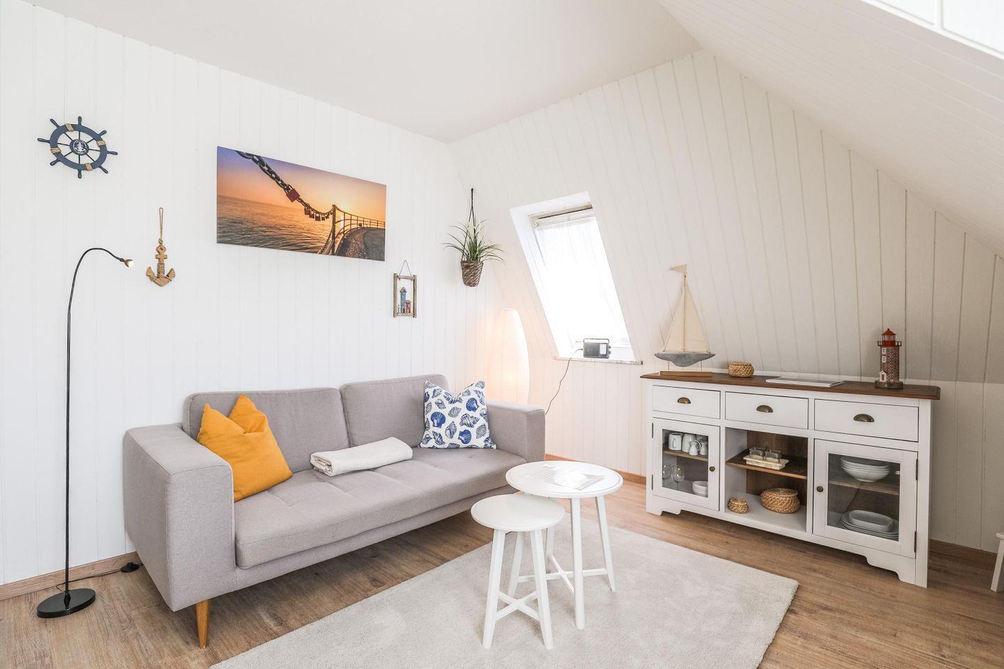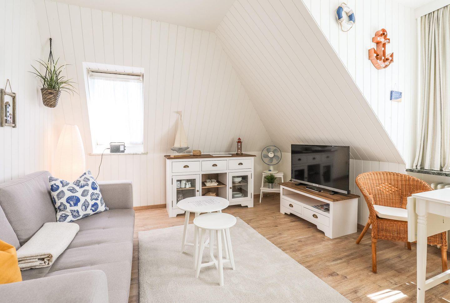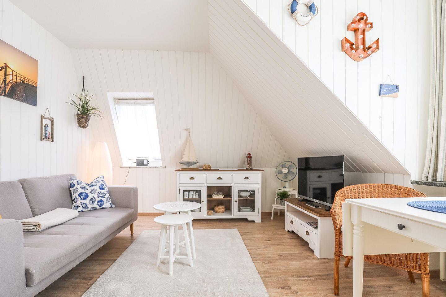 Die Ferienwohnung mit maritimem Flair. Der gemütliche Wohnraum lädt zum Verweilen ein. Helle Farben und ansprechende Möbel sorgen für ein behagliches Wohnklima. Auf dem großen Flachbildfernseher können Sie gemütlich fernsehen und auf dem Sofa den Abend entspannt ausklingen lassen. Die neue Pantry-Küche ist modern und zweckmäßig eingerichtet. Im kleinen Bad finden Sie alles für die tägliche Hygiene.