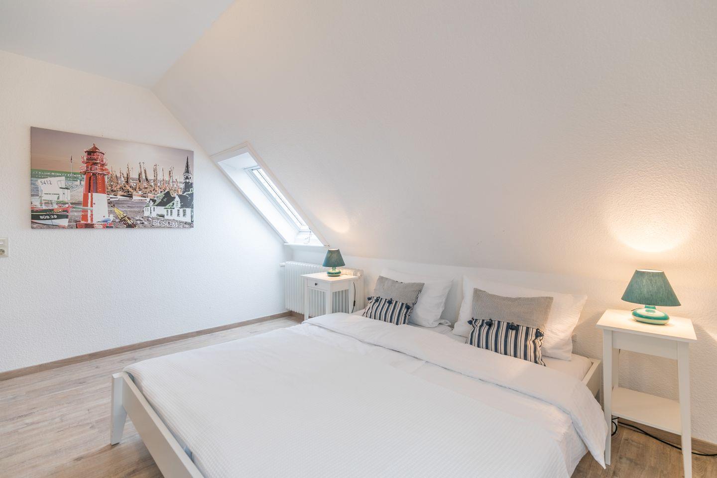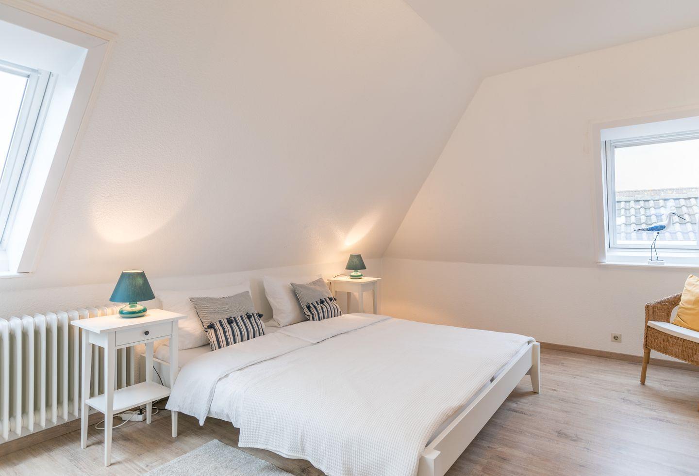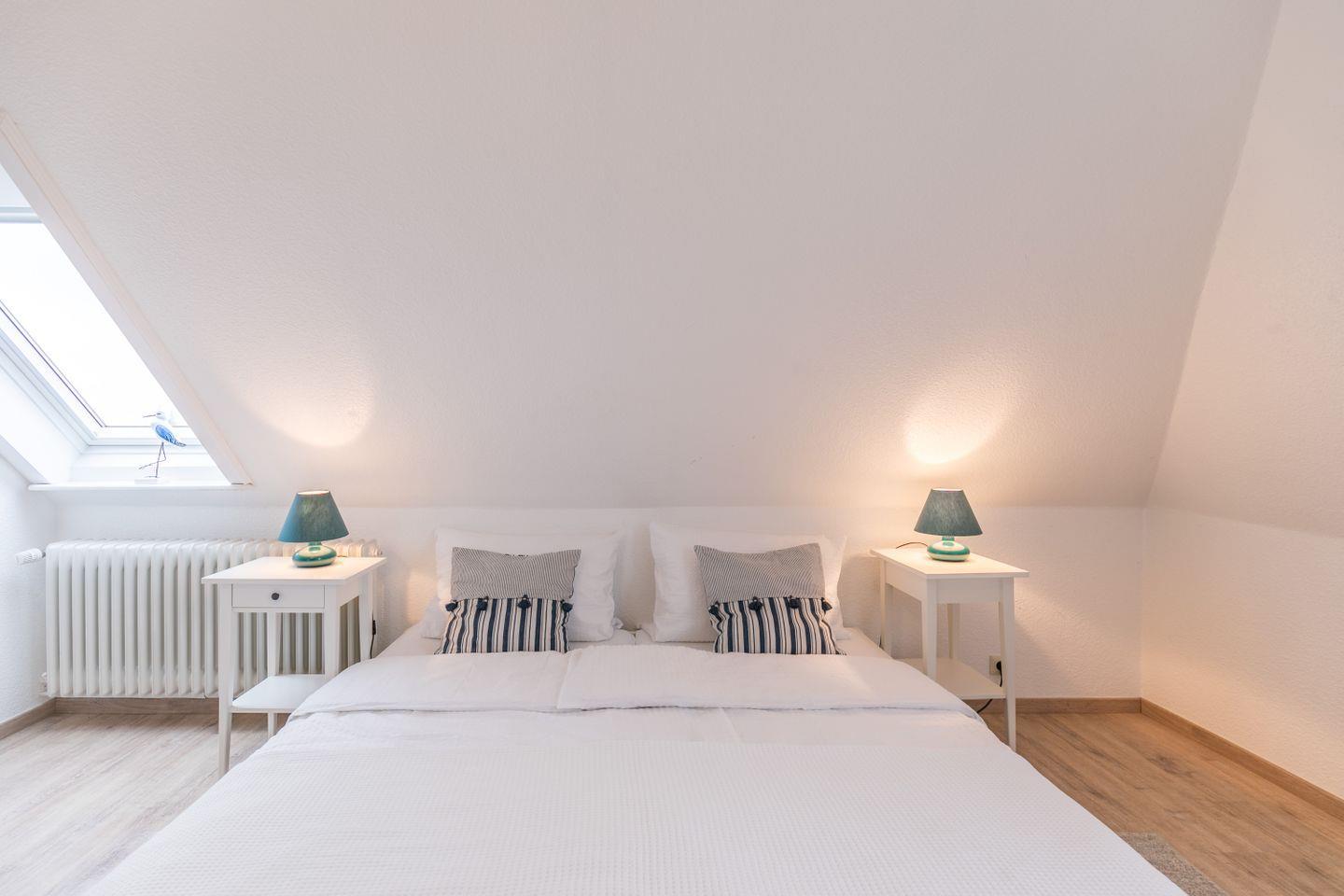 Im großen Schlafzimmer haben Sie genug Platz, um all Ihr Gepäck abzustellen. Das weiß gestrichene kleine Bad verfügt über ein Fenster zum Lüften.