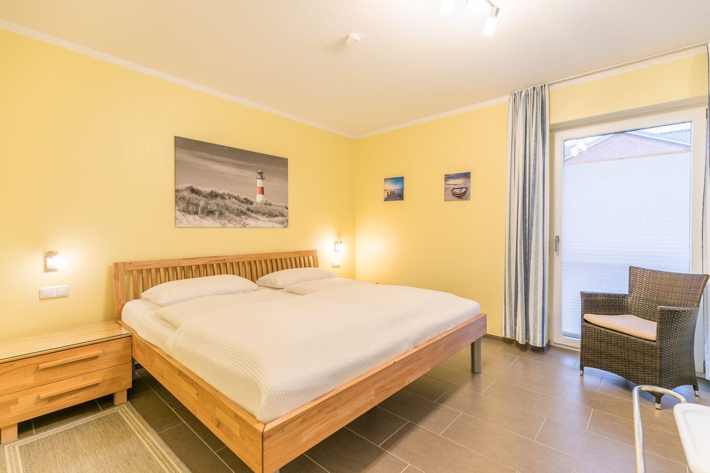 Doppelbett (2,00x2,00m) verstellbare Lattenroste Komforthöhe, großer Kleiderschrank, Nachttische, Sessel, Herrendiener, Außenrolladen, TV