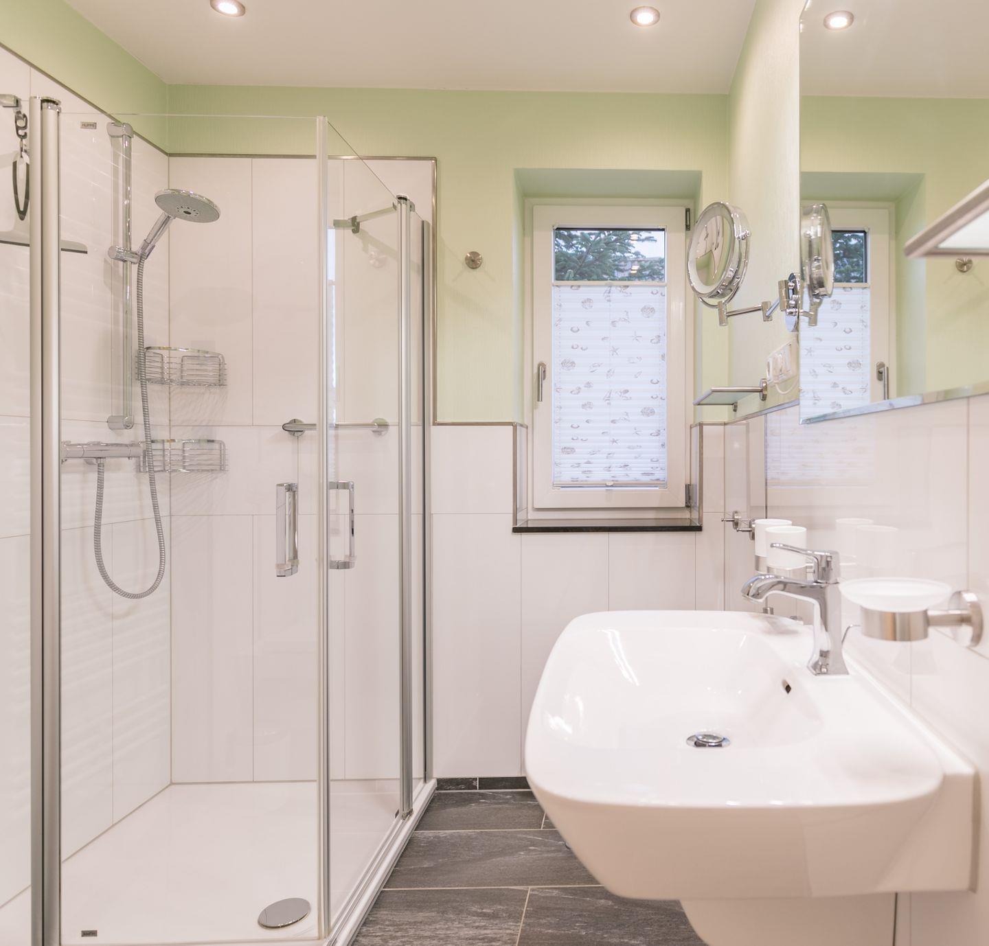 Ebenerdige Dusche, WC, Waschbecken, Spiegel, Fön, Fenster, Duschhocker, Handtuchwärmer