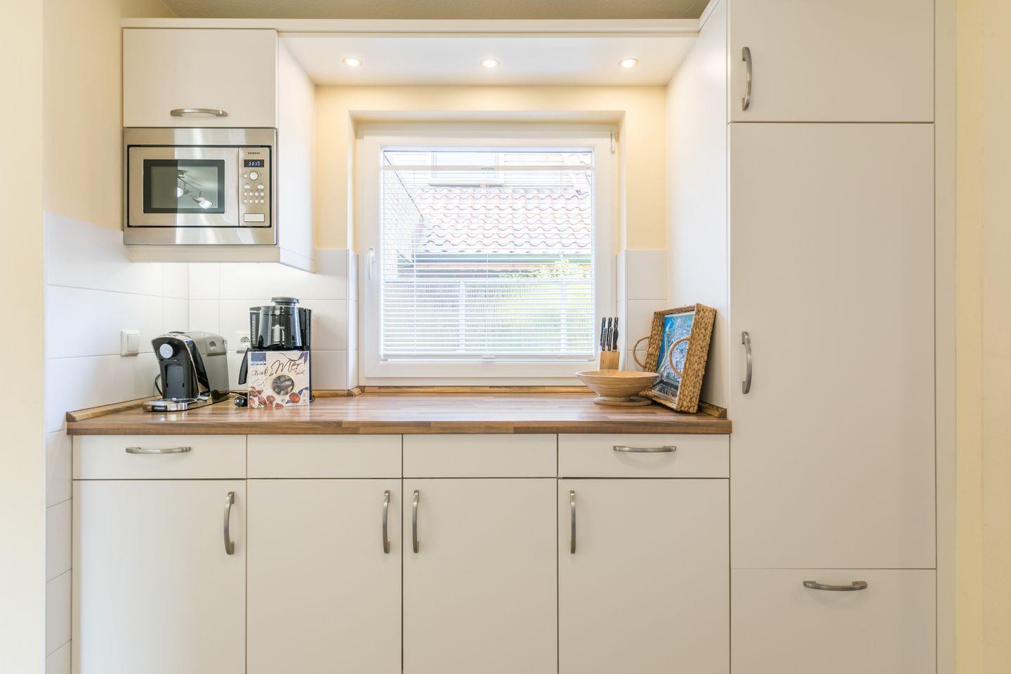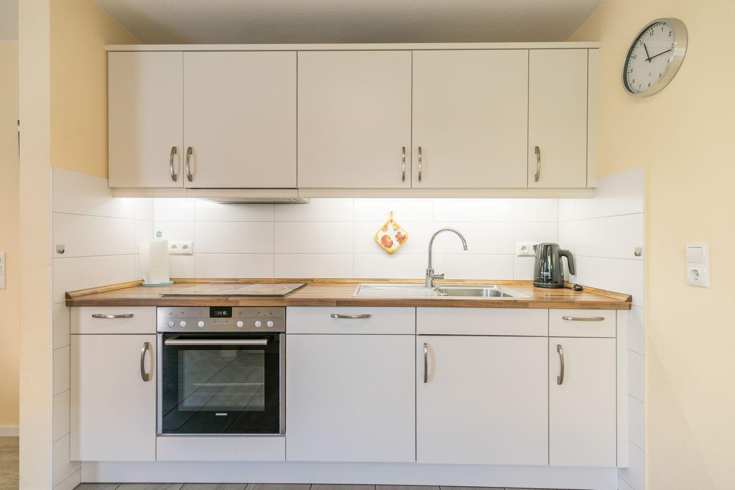 Cerankochfeld, Kühlschrank mit Gefrierfach, Geschirrspüler, Spüle, Backofen, Mikrowelle, Kaffeemaschine + Kaffeepadmaschine, Wasserkocher, Toaster, Eierkocher, Dunstabzug mit Umluft