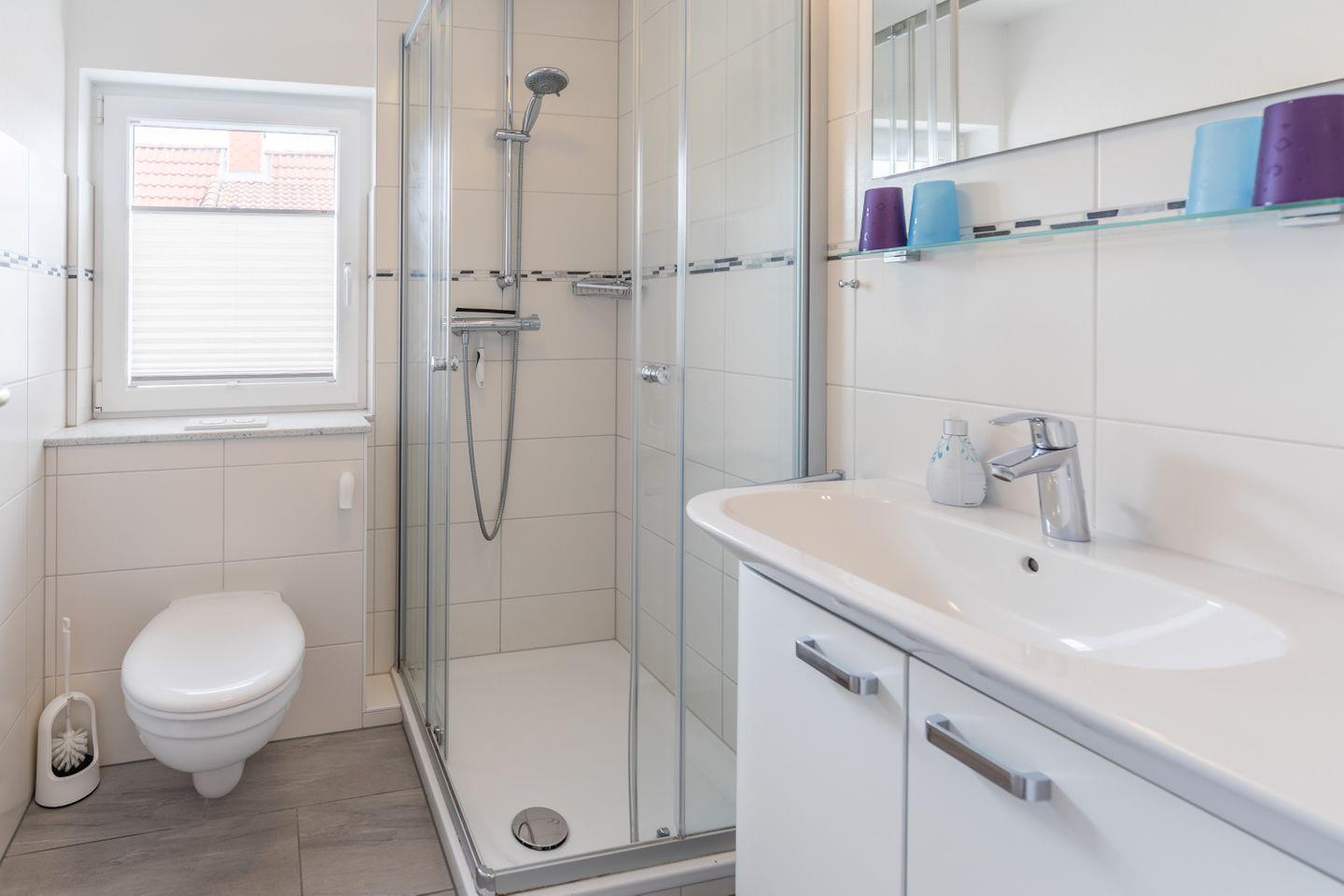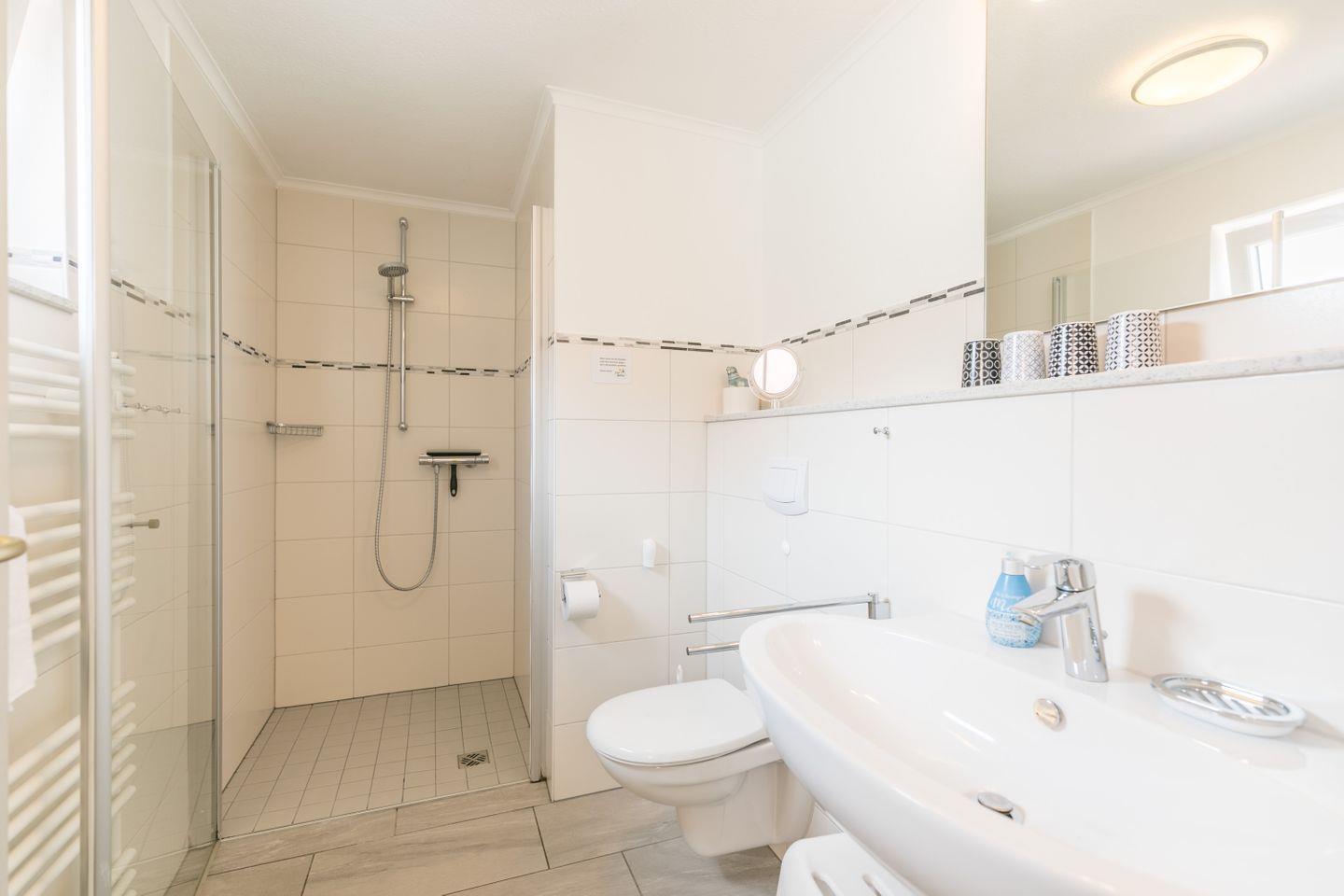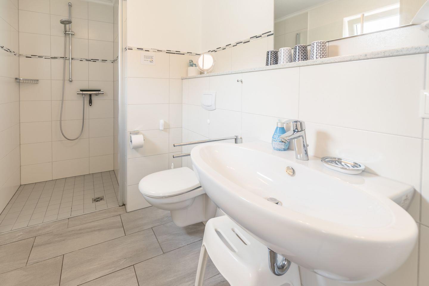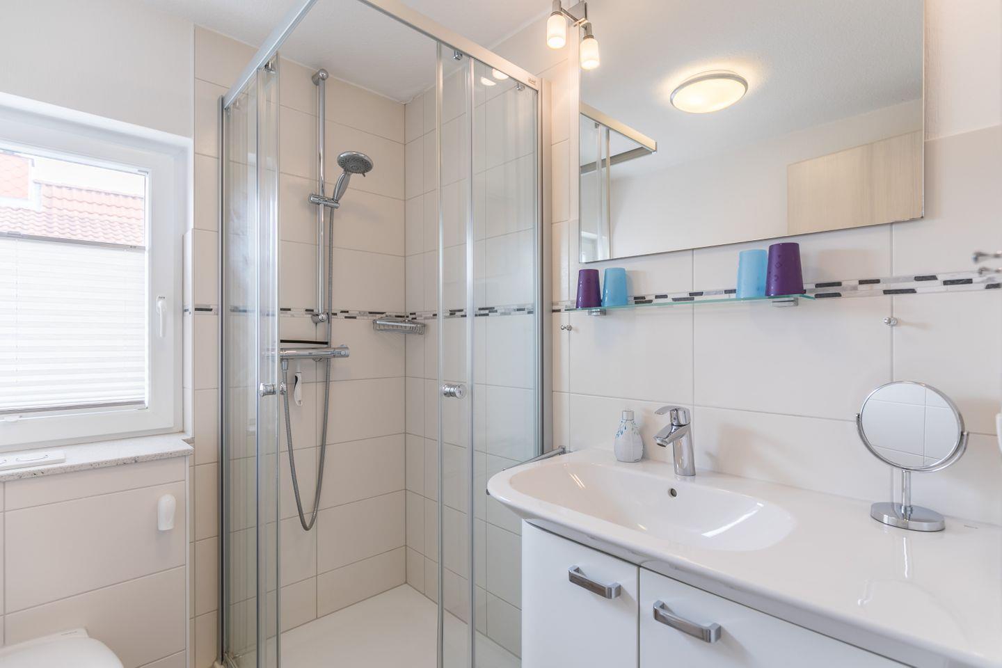 bodentiefe Dusche, Spiegel, WC, Handtuchtrockner, Waschbecken, Fenster, Fön, Duschhocker