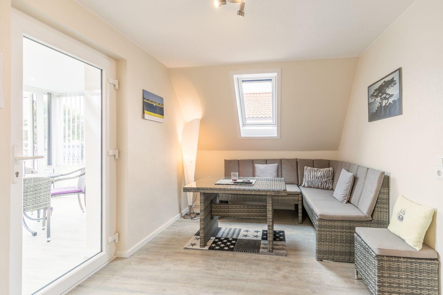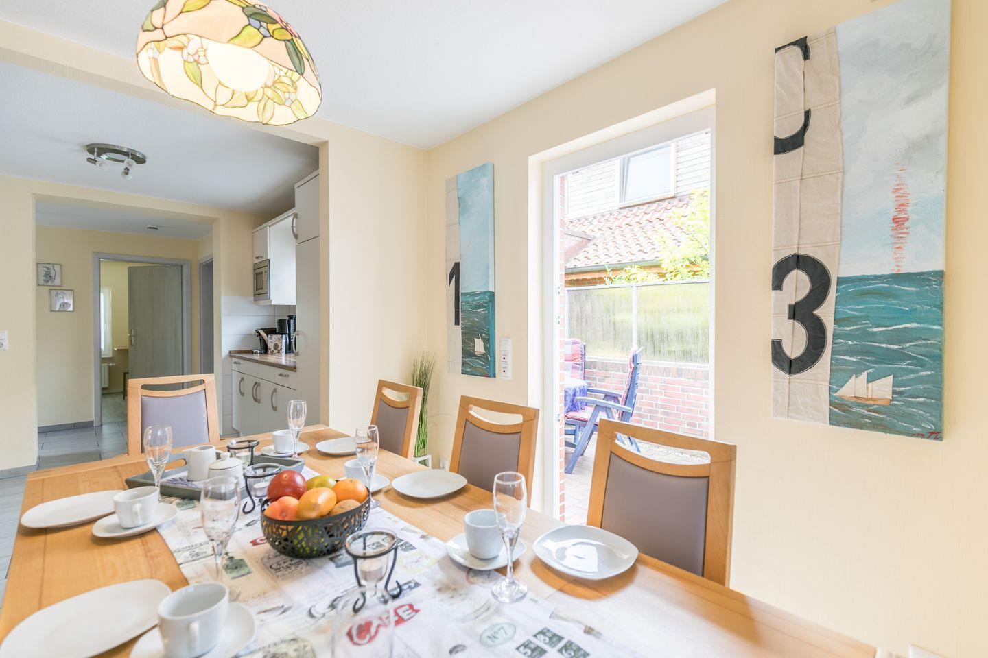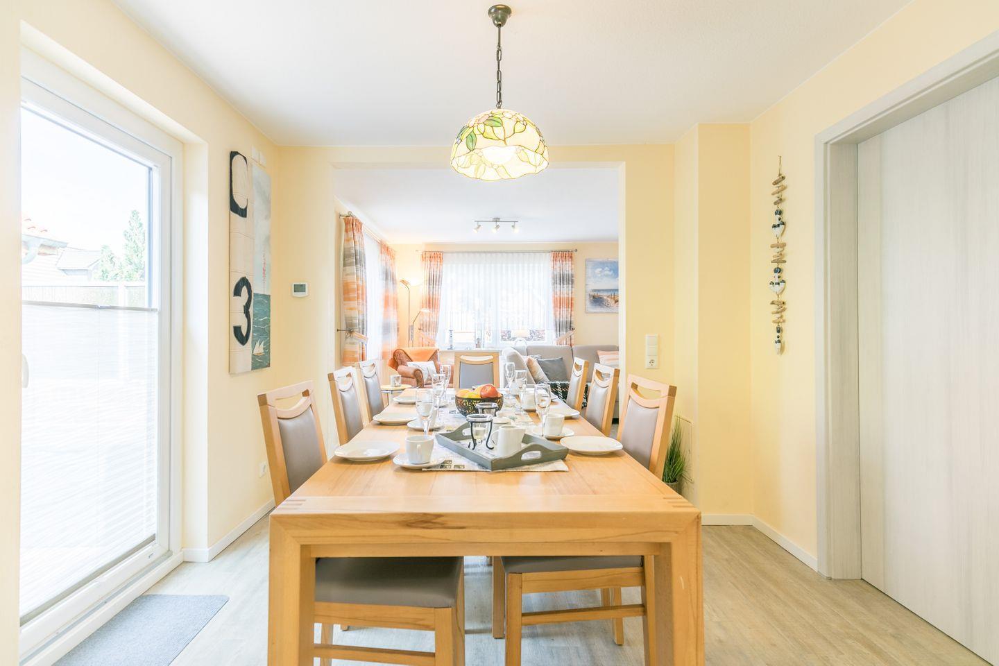 offen zum Wohnbereich und zur Küche, ausziehbarer Tisch mit Stühlen, Zugang zur Terrasse mit Markise