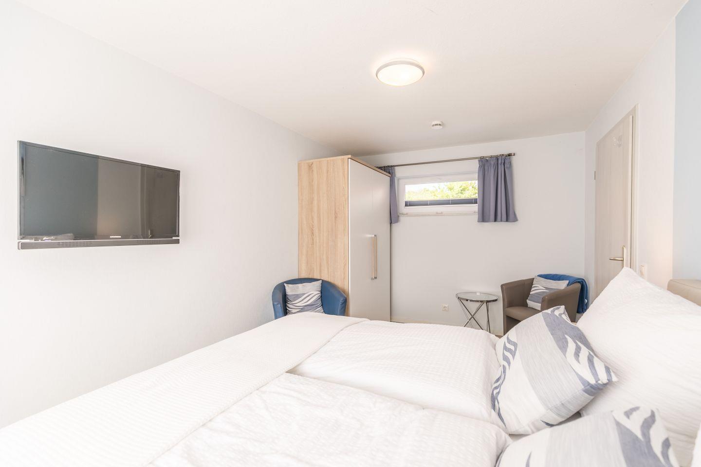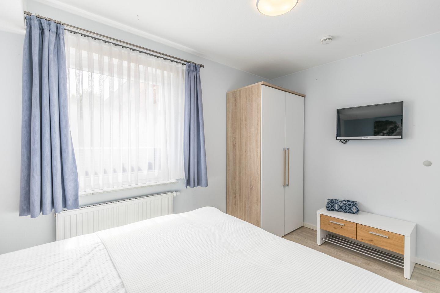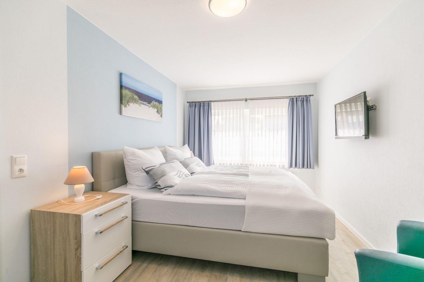 Boxspringdoppelbett (1,60x2,00m) mit großem Topper (Bettlaken 1,60 x 2,00 wird benötigt), Nachtschränke, Nachttischlampen, Radiowecker, Flachbild-TV, Kleiderschrank