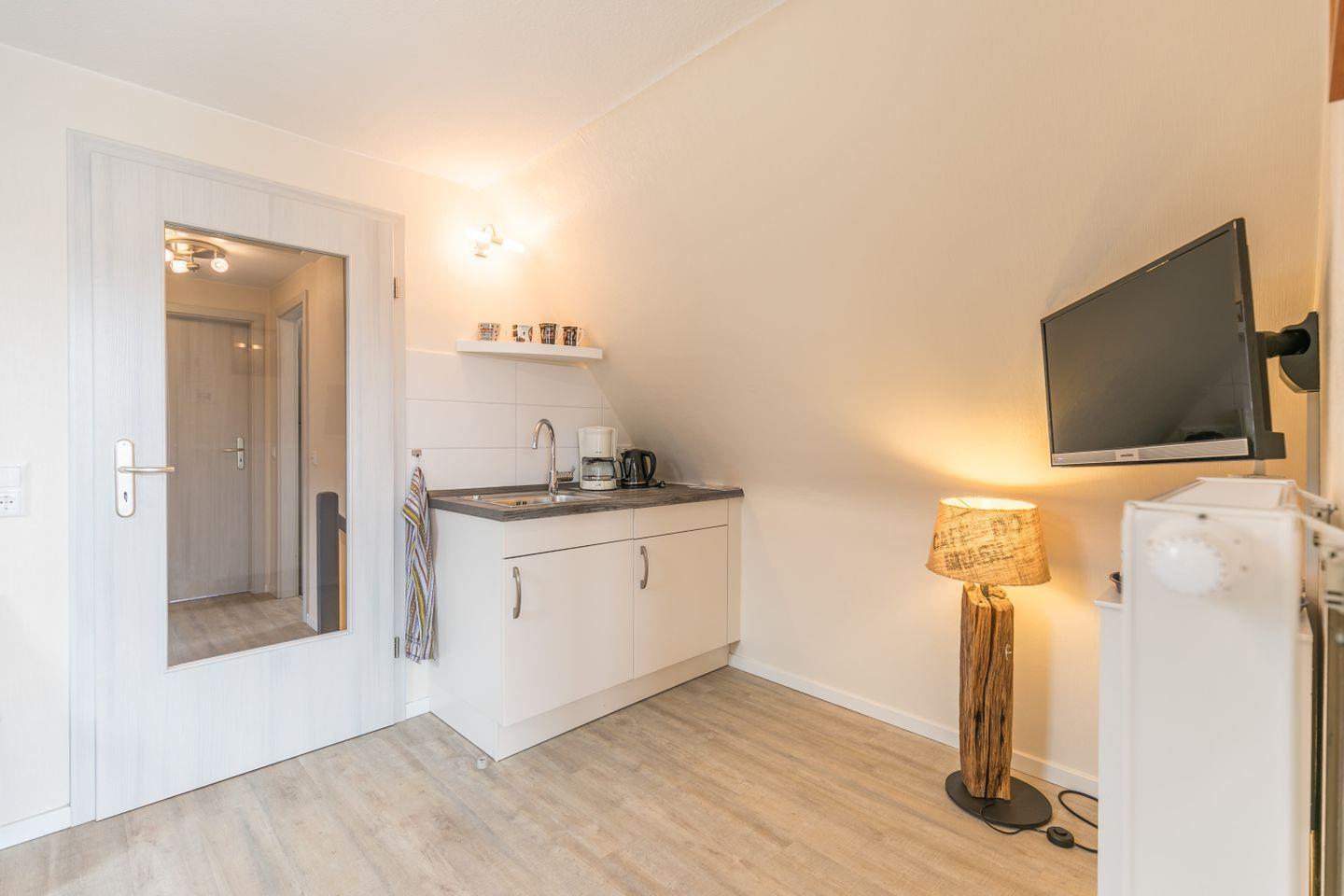 Sitzecke, kleine Pantryküche mit Spüle, Kaffeemaschine und Kühlschrank, Flachbild-TV, Zugang zum Sommerzimmer mit Balkon