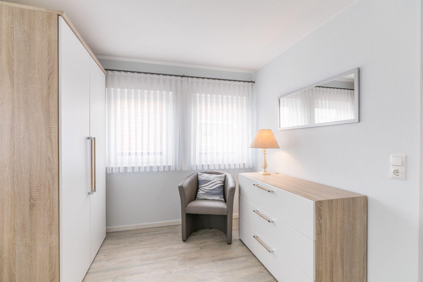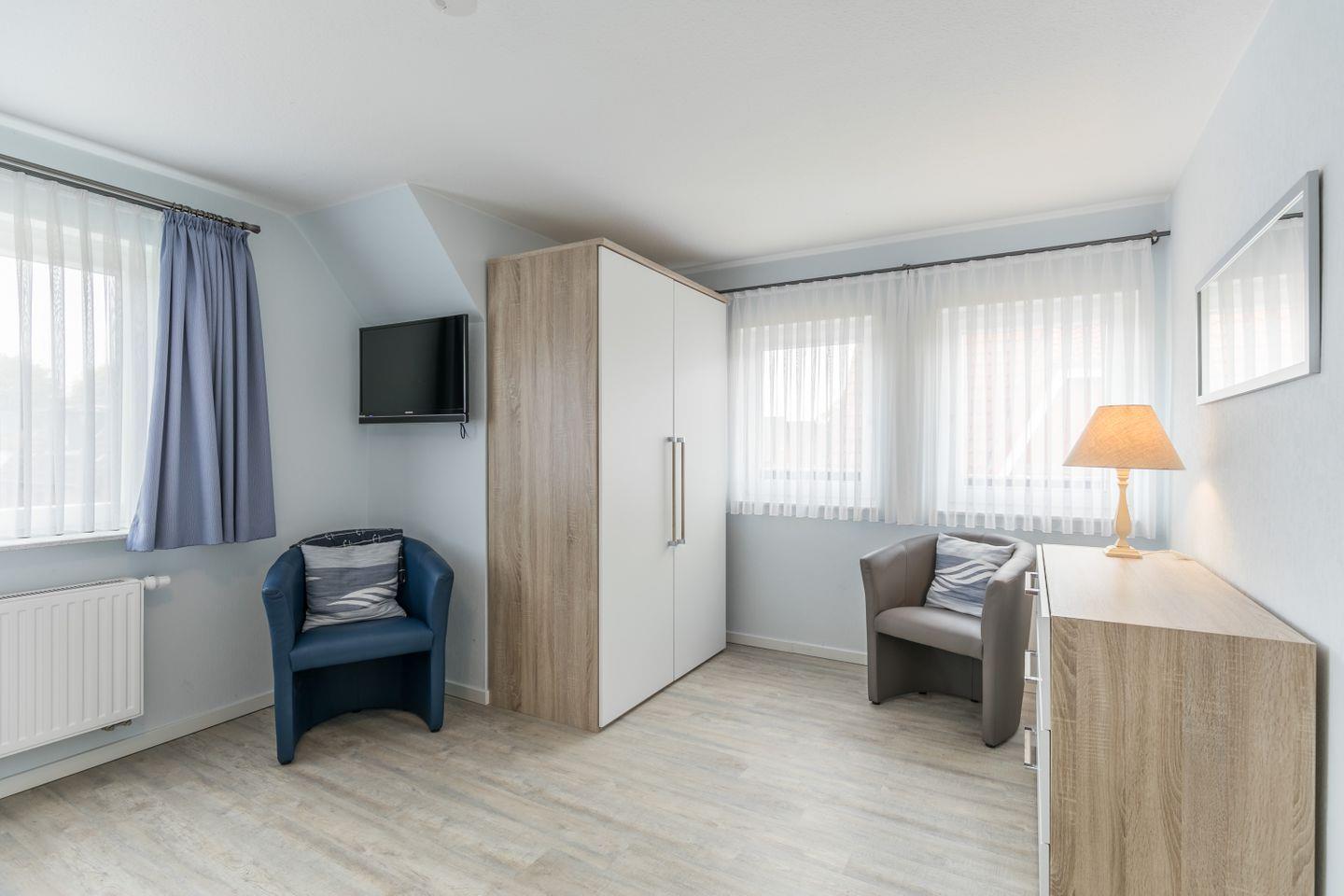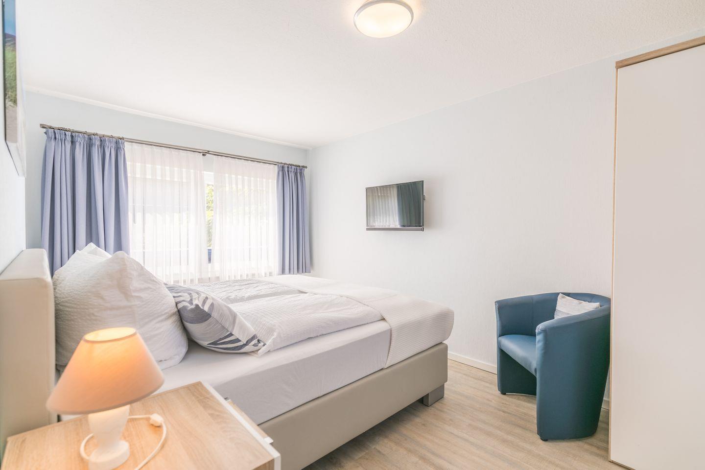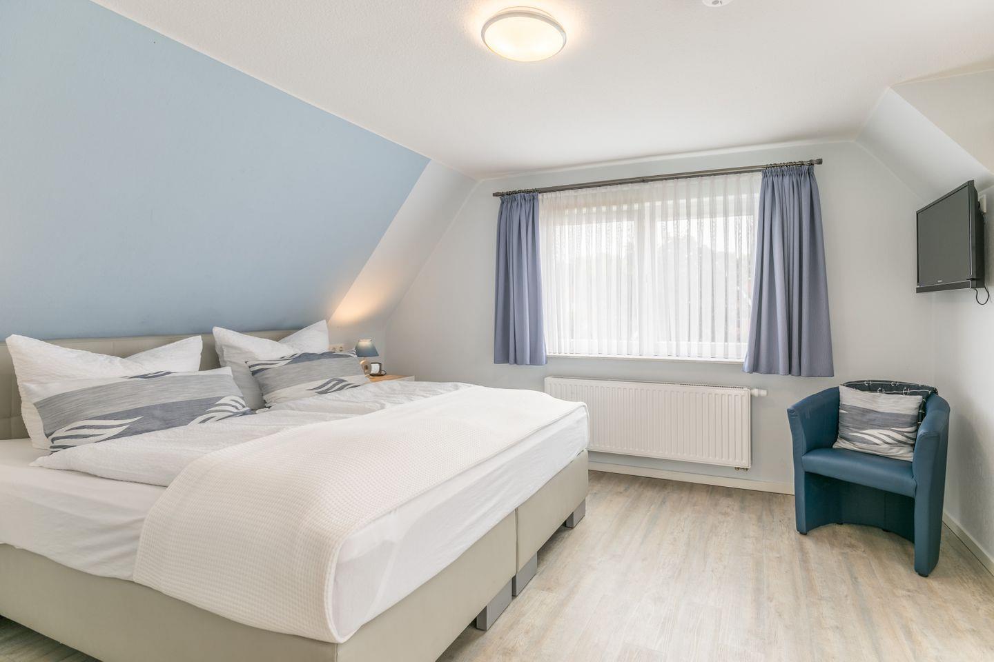 Boxspringdoppelbett (1,80x2,00m) mit großem Topper (Bettlaken 1,80 x 2,00 wird benötigt), Nachtschränke, Nachttischlampen, Radiowecker, Flachbild-TV, Kleiderschrank, Sessel