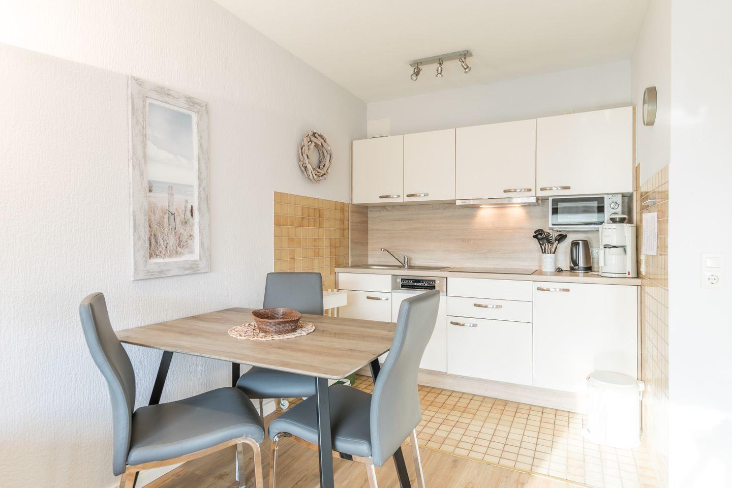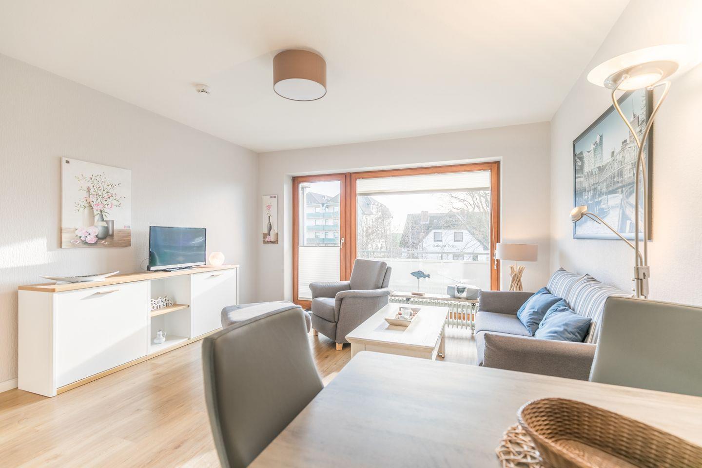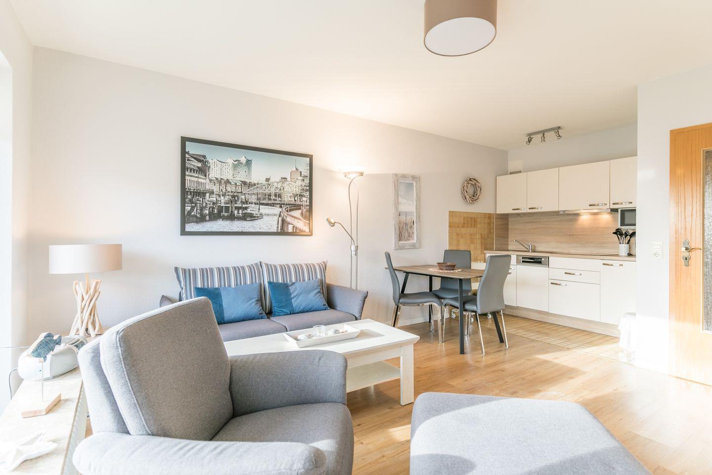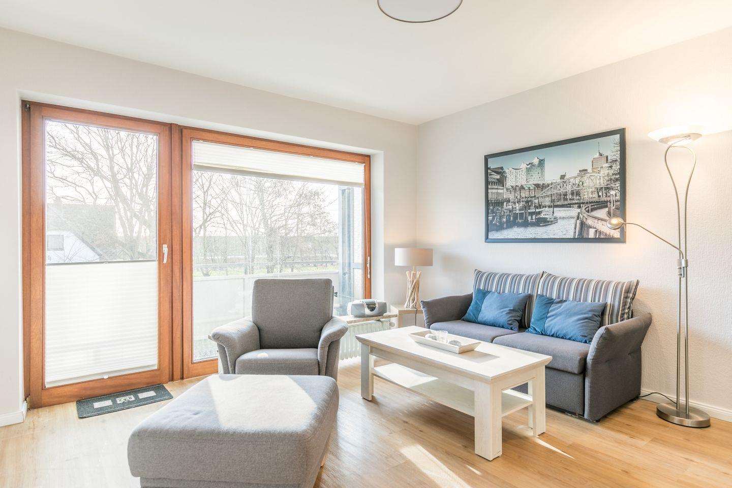 Die Wohnung verfügt über ein helles, offenes Wohnzimmer mit einer Couch, die sich bei Bedarf in ein bequemes Bett mit Schlaffunktion verwandeln lässt. Angrenzend befindet sich die gut ausgestattete Küchenzeile, die das Kochen in der Ferienwohnung zum Vergnügen macht. Vom Wohnzimmer aus gelangt man auf den Balkon, der mit Balkonmöbeln ausgestattet ist und zu erholsamen Stunden im Freien einlädt