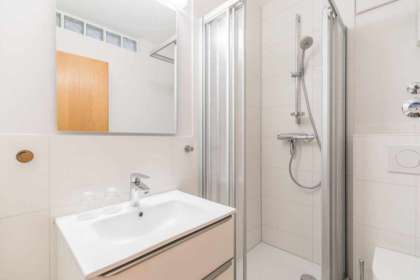 Dusche, WC, Waschbecken, Spiegel, Föhn, Handtuchtrockner